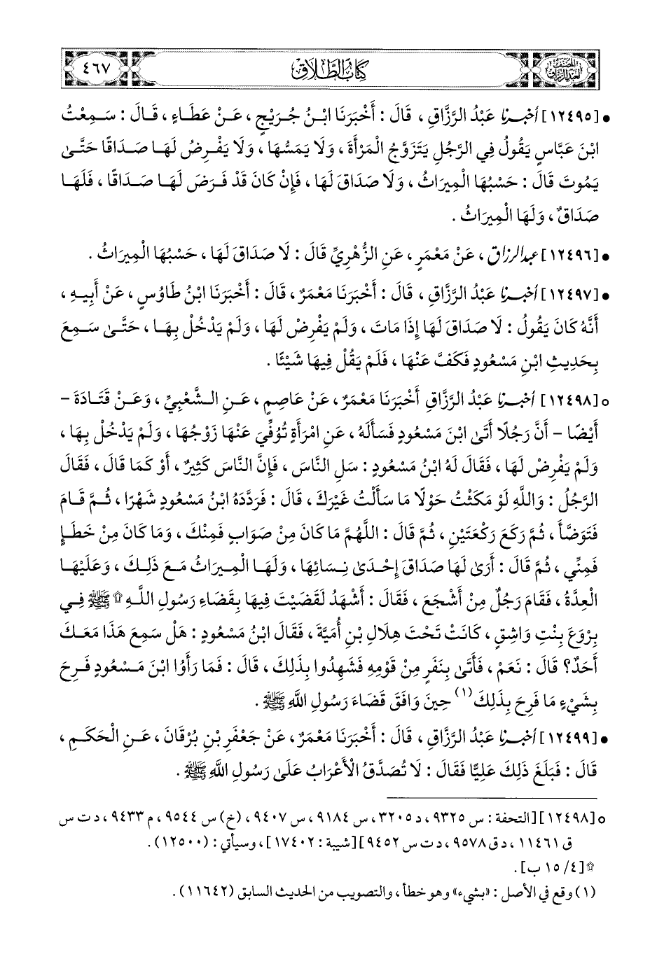 12498- أخبرنا عبد الرزاق، أَخْبَرَنَا مَعْمَرٌ، عَنْ عَاصِمٍ، عَنِ الشَّعْبِيِّ، وَعَنْ قَتَادَةَ أَيْضًا، أَنَّ رَجُلاً أَتَى ابْنَ مَسْعُودٍ فَسَأَلَهُ عَنِ امْرَأَةٍ تُوُفِّيَ عَنْهَا زَوْجُهَا، وَلَمْ يَدْخُلْ بِهَا، وَلَمْ يَفْرِضْ لَهَا، فَقَالَ لَهُ ابْنُ مَسْعُودٍ: سَلِ النَّاسَ، فَإِنَّ النَّاسَ كَثِيرٌ، أَوْ كَمَا قَالَ، فَقَالَ الرَّجُلُ: وَاللهِ لَوَ مَكَثْتُ حَوْلاً مَا سَأَلْتُ غَيْرَكَ، قَالَ: فَرَدَّدَهُ ابْنُ مَسْعُودٍ شَهْرًا، ثُمَّ قَامَ فَتَوَضَّأَ، ثُمَّ رَكَعَ رَكْعَتَيْنِ، ثُمَّ قَالَ: اللهُمَّ مَا كَانَ مِنْ صَوَابٍ فَمِنْكَ، وَمَا كَانَ مِنْ خَطَإِ فَمِنِّي، ثُمَّ قَالَ: أَرَى لَهَا صَدَاقَ إِحْدَى نِسَائِهَا، وَلَهَا المِيرَاثُ مَعَ ذَلِكَ، وَعَلَيْهَا الْعِدَّةُ، فَقَامَ رَجُلٌ مِنْ أَشْجَعَ، فَقَالَ: أَشْهَدُ لَقَضَيْتَ فِيهَا بِقَضَاءِ رَسُولِ اللهِ صَلَّى اللهُ عَلَيْهِ وَسَلَّمَ فِي بِرْوَعِ بِنْتِ وَاشِقٍ، كَانَتْ تَحْتَ هِلاَلِ بْنِ أُمَيَّةَ، فَقَالَ ابْنُ مَسْعُودٍ: هَلْ سَمِعَ هَذَا مَعَكَ أَحَدٌ؟ قَالَ: نَعَمْ، فَأَتَى بِنَفَرٍ مِنْ قَوْمِهِ، فَشَهِدُوا بِذَلِكَ، قَالَ: فَمَا رَأَوُا ابْنَ مَسْعُودٍ فَرِحَ بِشَيْءٍ مَا فَرِحَ بِذَلِكَ حِينَ وَافَقَ قَضَاءَ رَسُولِ اللهِ صَلَّى اللهُ عَلَيْهِ وَسَلَّمَ.