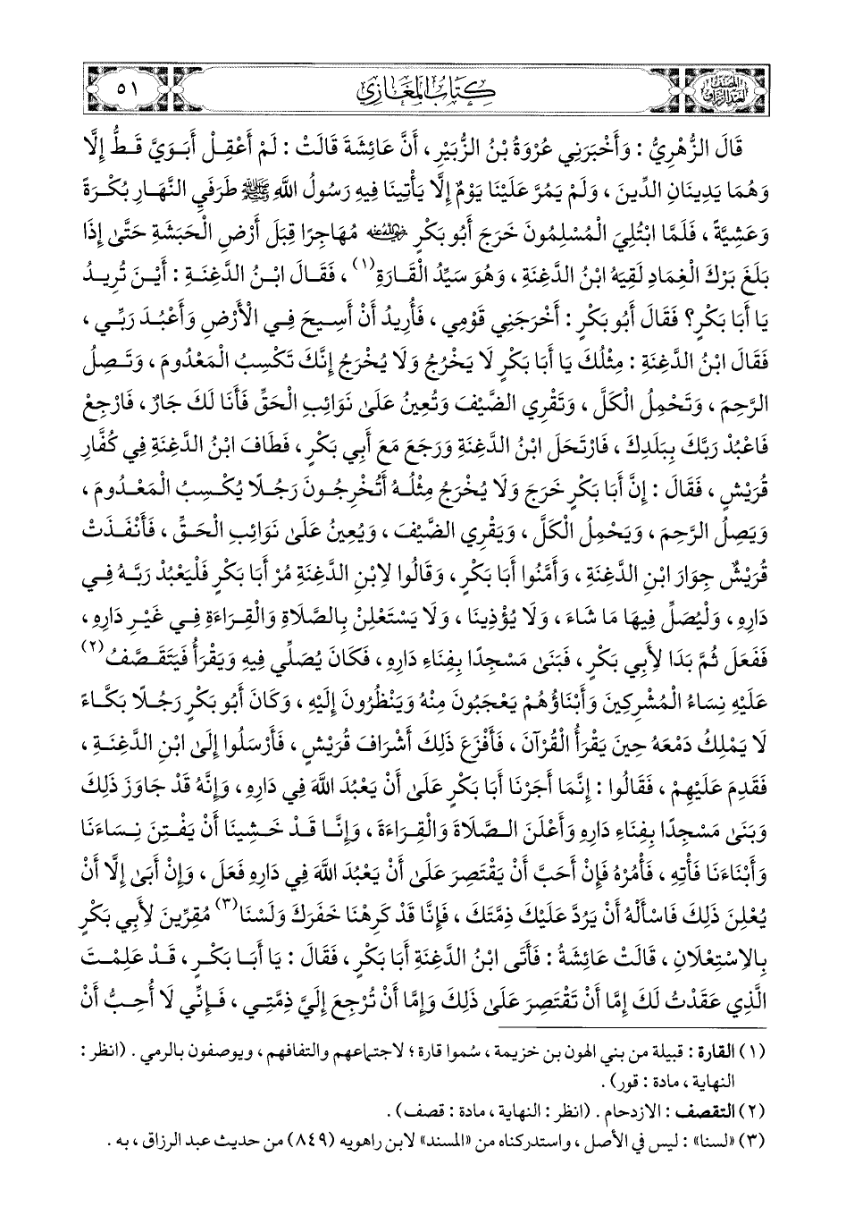 قَالَ الزُّهْرِيُّ: وَأَخْبَرَنِي عُرْوَةُ بن الزُّبَيْرِ، أَنَّ عَائِشَةَ قَالَتْ: لَمْ أَعْقِلْ أَبَوَيَّ قَطُّ إِلاَّ وَهُمَا يَدِينَانِ الدِّينَ، وَلَمْ يَمُرَّ عَلَيْنَا يَوْمٌ إِلاَّ يَأْتِينَا فِيهِ رَسُولُ اللهِ صَلَّى اللهُ عَلَيْهِ وَسَلَّمَ طَرَفَيِ النَّهَارِ بُكْرَةً وَعَشِيَّةً، فَلَمَّا ابْتُلِي المُسْلِمُونَ، خَرَجَ أَبو بَكْرٍ رَضِي اللهُ عَنْهُ مُهَاجِرًا قِبَلَ أَرْضِ الْحَبَشَةِ، حَتَّى إِذَا بَلَغَ بَرْكَ الْغِمَادِ، لَقِيَهُ ابْنُ الدَّغِنَةِ، وَهُوَ سَيِّدُ الْقَارَةِ، فَقَالَ ابْنُ الدَّغِنَةِ: أَيْنَ تُرِيدُ يَا أَبَا بَكْرٍ؟ فَقَالَ أَبو بَكْرٍ: أَخْرَجَنِي قَوْمِي، فَأُرِيدُ أَنَّ أَسِيحَ فِي الأَرْضِ، وَأَعْبُدَ رَبِّي، فَقَالَ ابْنُ الدَّغِنَةِ: مِثْلُكَ يَا أَبَا بَكْرٍ لاَ يُخْرَجُ، وَلاَ يَخْرُجُ، إِنَّكَ تُكْسِبُ المَعْدُومَ، وَتَصِلُ الرَّحِمَ، وَتَحْمِلُ الْكَلَّ، وَتَقْرِي الضَّيْفَ، وَتُعِينُ عَلَى نَوَائِبِ الْحَقِّ، فَأَنَا لَكَ جَارٌ، فَارْجِعْ، فَاعْبُدْ رَبَّكَ بِبَلَدِكَ، فَارْتَحَلَ ابْنُ الدَّغِنَةِ، وَرَجَعَ مَعَ أَبِي بَكْرٍ، فَطَافَ ابْنُ الدَّغِنَةِ فِي كُفَّارِ قُرَيْشٍ، فَقَالَ: إِنَّ أَبَا بَكْرٍ خَرَجَ وَلاَ يُخْرَجُ مِثْلُهُ، أَتُخْرِجُونَ رَجُلاً يُكْسِبُ المَعْدُومَ، وَيَصِلُ الرَّحِمَ، وَيَحْمِلُ الْكَلَّ، وَيَقْرِي الضَّيْفَ، وَيُعِينُ عَلَى نَوَائِبِ الْحَقِّ، فَأَنْفَذَتْ قُرَيْشٌ جِوَارَ ابْنِ الدَّغِنَةِ، وَأَمَّنُوا أَبَا بَكْرٍ، وَقَالُوا لاِبْنِ الدَّغِنَةِ: مُرْ أَبَا بَكْرٍ فَلْيَعْبُدْ رَبَّهُ فِي دَارِهِ، وَلْيُصَلِّ فِيهَا مَا شَاءَ، وَلاَ يُؤْذِينَا، وَلاَ يَسْتَعْلِنُ بِالصَّلاَةِ وَالْقِرَاءَةِ فِي غَيْرِ دَارِهِ، فَفَعَلَ، ثُمَّ بَدَا لأَبِي بَكْرٍ، فَبَنَى مَسْجِدًا بِفِنَاءِ دَارِهِ، فَكَانَ يُصَلِّي فِيهِ وَيَقْرَأُ، فَيَتَقَصَّفُ عَلَيْهِ نِسَاءُ المُشْرِكِينَ وَأَبْنَاؤُهُمْ، يَعْجَبُونَ مِنْهُ، وَيَنْظُرُونَ إِلَيْهِ،