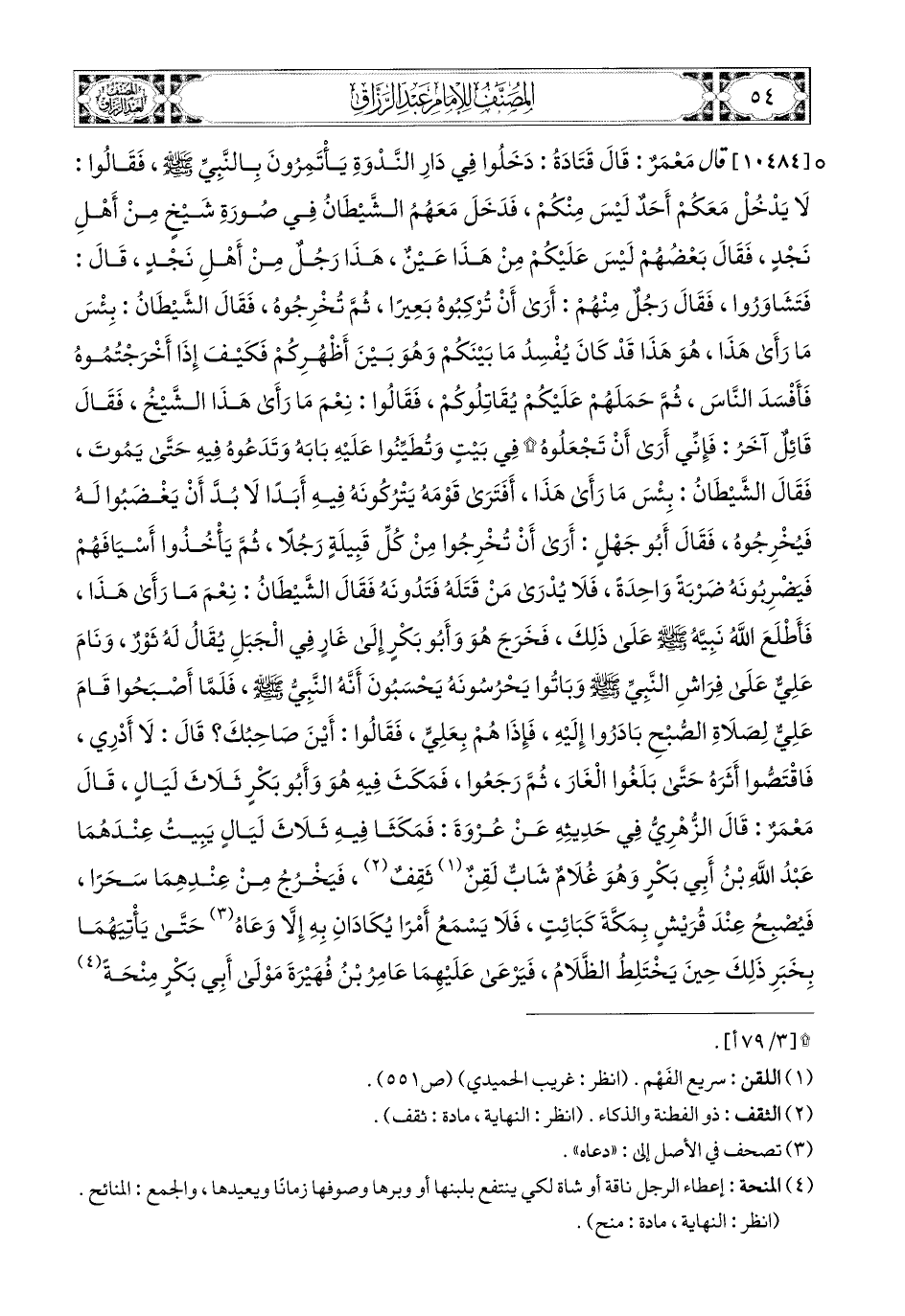 10484- قَالَ مَعْمَرٌ: قَالَ قَتَادَةُ: دَخَلُوا فِي دَارِ النَّدْوَةِ يَأْتَمِرُونَ بِالنَّبِيِّ صَلَّى اللهُ عَلَيْهِ وَسَلَّمَ، فَقَالُوا: لاَ يَدْخُلْ مَعَكُمْ أَحَدٌ لَيْسَ مِنْكُمْ، فَدَخَلَ مَعَهُمُ الشَّيْطَانُ، فِي صُورَةِ شَيْخٍ مِنْ أَهْلِ نَجْدٍ، فَقَالَ بَعْضُهُمْ: لَيْسَ عَلَيْكُمْ مِنْ هَذَا عَيْنٌ، هَذَا رَجُلٌ مِنْ أَهْلِ نَجْدٍ، قَالَ: فَتَشَاوَرُوا، فَقَالَ رَجُلٌ مِنْهُمْ: أَرَى أَنْ تُرْكِبُوهُ بَعِيرًا، ثُمَّ تُخْرِجُوهُ فَقَالَ الشَّيْطَانُ: بِئْسَ مَا رَأَى هَذَا، هُوَ هَذَا قَدْ كَانَ يُفْسِدُ مَا بَيْنَكُمْ وَهُوَ بَيْنَ أَظْهُرِكُمْ، فَكَيْفَ إِذَا أَخَرَجْتُمُوهُ فَأَفْسَدَ النَّاسَ، ثُمَّ حَمَلَهُمْ عَلَيْكُمْ يُقَاتِلُوكُمْ، فَقَالُوا: نِعْمَ مَا رَأَى هَذَا الشَّيْخُ، فَقَالَ قَائِلٌ آخَرَ: فَإِنِّي أَرَى أَنْ تَجْعَلُوهُ فِي بَيْتٍ وَتُطَيِّنُوا عَلَيْهِ بَابَهُ، وَتَدَعُوهُ فِيهِ حَتَّى يَمُوتَ، فَقَالَ الشَّيْطَانُ: بِئْسَ مَا رَأَى هَذَا، أَفَتَرَى قَوْمَهُ يَتْرُكُونَهُ فِيهِ أَبَدًا، لاَ بُدَّ أَنْ يَغْضَبُوا لَهُ، فَيُخْرِجُوهُ، فَقَالَ أَبو جَهْلٍ: أَرَى أَنْ تُخْرِجُوا مِنْ كُلِّ قَبِيلَةٍ رَجُلاً، ثُمَّ يَأْخُذُوا أَسْيَافَهُمْ، فَيَضْرِبُونَهُ ضَرْبَةً وَاحِدَةً، فَلاَ يُدْرَى مَنْ قَتَلَهُ فَتَدُونَهُ، فَقَالَ الشَّيْطَانُ: نِعْمَ مَا رَأَى هَذَا، فَأَطْلَعَ اللهُ نَبِيَّهُ صَلَّى اللهُ عَلَيْهِ وَسَلَّمَ عَلَى ذَلِكَ، فَخَرَجَ هُوَ وَأَبو بَكْرٍ إِلَى غَارٍ فِي الْجَبَلِ، يُقَالُ لَهُ: ثَوْرٌ، وَنَامَ عَلِيٌّ عَلَى فِرَاشِ النَّبِيِّ صَلَّى اللهُ عَلَيْهِ وَسَلَّمَ، وَبَاتُوا يَحْرُسُونَهُ، يَحْسِبُونَ أَنَّهُ النَّبِيَّ صَلَّى اللهُ عَلَيْهِ وَسَلَّمَ، فَلَمَّا أَصْبَحُوا قَامَ عَلِيٌّ لِصَلاَةِ الصُّبْحِ بَادَرُوا إِلَيْهِ، فَإِذَا هُمْ بِعَلِيٍّ، فَقَالُوا: أَيْنَ صَاحِبُكَ؟ قَالَ: لاَ أَدْرِي، فَاقْتَصُّوا أَثَرَهُ، حَتَّى بَلَغُوا الْغَارَ، ثُمَّ رَجَعُوا فَمَكَثَ فِيهِ هُوَ وَأَبو بَكْرٍ ثَلاَثَ لَيَالٍ.