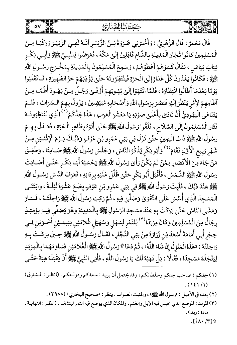 فَقَامَ وَأَبو بَكْرٍ يُذَكِّرُ النَّاسَ، وَجَلَسَ رَسُولِ اللهِ صَلَّى اللهُ عَلَيْهِ وَسَلَّمَ صَامَتًا، وَطَفِقَ مَنْ جَاءَ مِنَ الأَنْصَارِ مِمَّنْ لَمْ يَكُنْ رَأَى رَسُولَ اللهِ صَلَّى اللهُ عَلَيْهِ وَسَلَّمَ يَحْسِبُهُ أَبَا بَكْرٍ، حَتَّى أَصَابَتْ رَسُولَ اللهِ صَلَّى اللهُ عَلَيْهِ وَسَلَّمَ الشَّمْسَ، فَأَقْبَلَ أَبو بَكْرٍ، حَتَّى ظَلَّلَ عَلَيْهِ بِرِدَائِهِ، فَعَرَفَ النَّاسُ رَسُولَ اللهِ صَلَّى اللهُ عَلَيْهِ وَسَلَّمَ عِنْدَ ذَلِكَ، فَلَبِثَ رَسُولُ اللهِ صَلَّى اللهُ عَلَيْهِ وَسَلَّمَ فِي بَنِي عَمْرِو بنِ عَوْفٍ بِضْعَ عَشْرَةَ لَيْلَةً، وابْتَنَى المَسْجِدَ الَّذِي أُسِّسَ عَلَى التَّقْوَى، وَصَلَّى فِيهِ، ثُمَّ رَكِبَ رَسُولُ اللهِ صَلَّى اللهُ عَلَيْهِ وَسَلَّمَ رَاحِلَتَهُ، فَسَارَ وَمَشَى النَّاسُ، حَتَّى بَرَكَتْ بِهِ عِنْدَ مَسْجِدِ الرَّسُولِ صَلَّى اللهُ عَلَيْهِ وَسَلَّمَ بِالمَدِينَةِ وَهُوَ يُصَلِّي فِيهِ يَوْمَئِذٍ رِجَالٌ مِنَ المُسْلِمِينَ، وَكَانَ مِرْبَدًا لِلتَّمْرِ لِسَهْلٍ وَسُهَيْلٍ، غُلاَمَيْنِ يَتِيمَيْنِ أَخَوَيْنِ فِي حِجْرِ أَبِي أُمَامَةَ أَسْعَدِ بْنِ زُرَارَةَ مِنْ بَنِي النَّجَّارِ، فَقَالَ رَسُولُ اللهِ صَلَّى اللهُ عَلَيْهِ وَسَلَّمَ حِينَ بَرَكَتْ بِهِ رَاحِلَتُهُ: هَذَا المَنْزِلُ إِنْ شَاءَ اللهُ، ثُمَّ دَعَا رَسُولُ اللهِ صَلَّى اللهُ عَلَيْهِ وَسَلَّمَ الْغُلاَمَيْنِ، فَسَاوَمَهُمَا بِالمِرْبَدِ لِيَتَّخِذَهُ مَسْجِدًا، فَقَالاَ: بَلْ نَهَبُهُ لَكَ يَا رَسُولَ اللهِ، فَأَبَى النَّبِيُّ صَلَّى اللهُ عَلَيْهِ وَسَلَّمَ أَنْ يَقْبَلَهُ هِبَةً، حَتَّى ابْتَاعَهُ مِنْهُمَا، وَبَنَاهُ مَسْجِدًا، وَطَفِقَ رَسُولُ اللهِ صَلَّى اللهُ عَلَيْهِ وَسَلَّمَ يَنْقُلُ مَعَهُمُ اللَّبِنَ فِي ثِيَابِهِ وَهُوَ يَقُولُ: