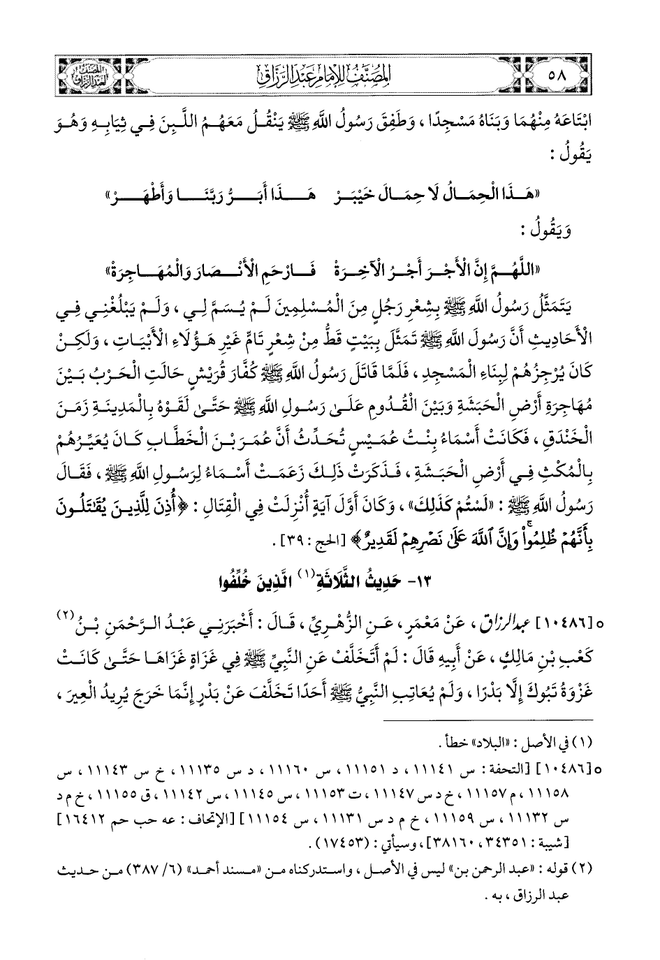 10486- عبد الرزاق، عَنْ مَعْمَرٍ، عَنِ الزُّهْرِيِّ، قَالَ: أَخْبَرَنِي عَبدُ الرَّحْمَنِ بن كَعْبِ بْنِ مَالِكٍ، عَنْ أَبِيهِ، قَالَ: لَمْ أَتَخَلَّفْ عَنِ النَّبِيِّ صَلَّى اللهُ عَلَيْهِ وَسَلَّمَ فِي غَزَاةٍ غَزَاهَا، حَتَّى كَانَتْ غَزْوَةُ تَبُوكَ، إِلاَّ بَدْرًا، وَلَمْ يُعَاتِبِ النَّبِيُّ صَلَّى اللهُ عَلَيْهِ وَسَلَّمَ أَحَدًا تَخَلَّفَ عَن بَدْرٍ، إِنَّمَا خَرَجَ يُرِيدُ الْعِيرَ، فَخَرَجَتْ قُرَيْشٌ مُغَوِّثِينَ لِعِيرِهِمْ، فَالْتَقَوْا عَن غَيْرِ مَوْعِدٍ، كَمَا قَالَ اللهُ، وَلَعَمْرِي إِنَّ أَشْرَفَ مَشَاهِدَ رَسُولِ اللهِ صَلَّى اللهُ عَلَيْهِ وَسَلَّمَ فِي النَّاسِ لَبَدْرٌ، وَمَا أُحِبُّ أَنِّي كُنْتُ شَهِدْتُ مَكَانَ بَيْعَتِي لَيْلَةَ الْعَقَبَةِ حَيْثُ تَوَاثَقْنَا عَلَى الإِسْلاَمِ، ثُمَّ لَمْ أَتَخَلَّفْ بَعْدُ عَنِ النَّبِيِّ صَلَّى اللهُ عَلَيْهِ وَسَلَّمَ فِي غَزَاةٍ غَزَاهَا، حَتَّى كَانَتْ غَزْوَةُ تَبُوكَ، وَهِيَ آخِرُ غَزْوَةٍ غَزَاهَا، وَآذِنَ النَّبِيُّ صَلَّى اللهُ عَلَيْهِ وَسَلَّمَ النَّاسَ بِالرَّحِيلِ وَأَرَادَ أَنْ يَتَأَهَّبُوا أُهْبَةَ غَزْوِهِمْ، وَذَلِكَ حِينَ طَابَ الظِّلاَلُ، وَطَابَتِ الثِّمَارُ،