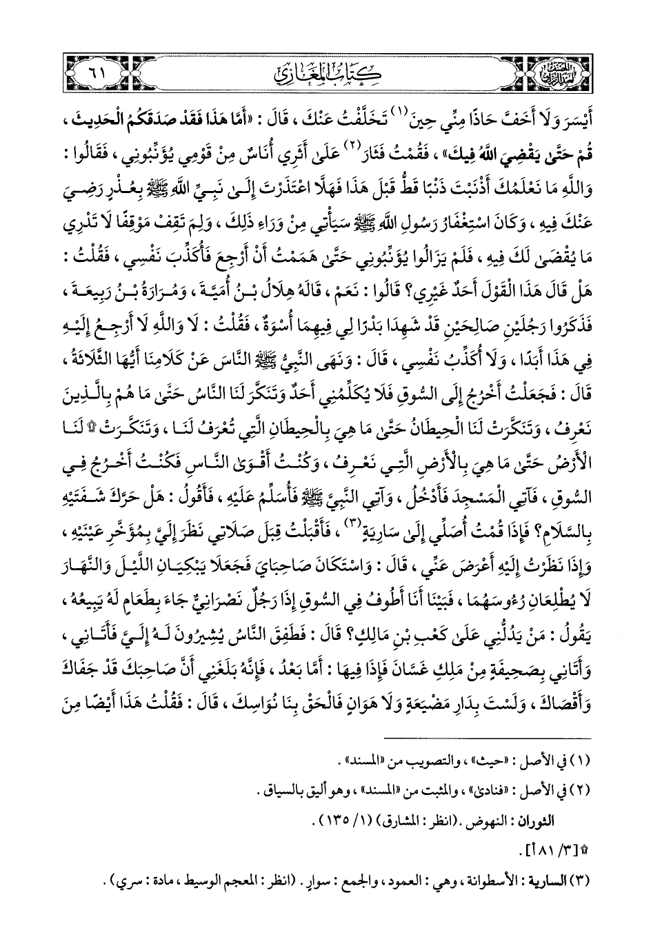 فَقُلْتُ: هَلْ قَالَ هَذَا الْقَوْلَ أَحَدٌ غَيْرِي؟ قَالُوا: نَعَمْ، قَالَهُ هِلاَلُ بن أُمَيَّةَ، وَمُرَارَةُ بن رَبِيعَةَ، فَذَكَرُوا رَجُلَيْنِ صَالِحَيْنِ، قَدْ شَهِدَا بَدْرًا، لِي فِيهِمَا أُسْوَةٌ، فَقُلْتُ: لاَ وَاللهِ لاَ أَرْجِعُ إِلَيْهِ فِي هَذَا أَبَدًا، وَلاَ أُكَذِّبُ نَفْسِي، قَالَ: وَنَهَى النَّبِيُّ صَلَّى اللهُ عَلَيْهِ وَسَلَّمَ النَّاسَ عَن كَلاَمِنَا أَيُّهَا الثَّلاَثَةُ، قَالَ: فَجَعَلْتُ أَخْرَجُ إِلَى السُّوقِ، فَلاَ يُكَلِّمُنِي أَحَدٌ، وَتَنَكَّرَ لَنَا النَّاسُ، حَتَّى مَا هُمْ بِالَّذِينَ نَعْرِفُ، وَتَنَكَّرَتْ لَنَا الْحِيطَانُ، حَتَّى مَا هِيَ بِالْحِيطَانِ الَّتِي تَعْرِفُ لَنَا، وَتَنَكَّرَتْ لَنَا الأَرْضُ، حَتَّى مَا هِيَ بِالأَرْضِ الَّتِي نَعْرِفُ، وَكُنْتُ أَقْوَى النَّاسِ، فَكُنْتُ أَخْرَجُ فِي السُّوقِ، فَآتِي المَسْجِدَ، فَأَدْخَلُ، وَآتِي النَّبِيَّ صَلَّى اللهُ عَلَيْهِ وَسَلَّمَ فَأُسَلِّمُ عَلَيْهِ، فَأَقُولُ: هَلْ حَرَّكَ شَفَتَيْهِ بِالسَّلاَمِ؟ فَإِذَا قُمْتُ أُصَلِّي إِلَى سَارِيَةٍ، فَأَقْبَلْتُ قِبَلَ صَلاَتِي، نَظَرَ إِلَيَّ بِمُؤَخِّرِ عَيْنَيْهِ، وَإِذَا نَظَرْتُ إِلَيْهِ أَعْرَضَ عَنِّي، قَالَ: وَاسْتَكَانَ صَاحِبَايَ، فَجَعَلاَ يَبْكِيَانِ اللَّيْلَ وَالنَّهَارَ، لاَ يُطْلِعَانِ رُؤُوسَهُمَا، فَبَيْنَا أَنَا أَطُوفُ فِي السُّوقِ، إِذَا رَجُلٌ نَصْرَانِيٌّ جَاءَ بِطَعَامٍ لَهُ يَبِيعُهُ، يَقُولُ: مَنْ يَدُلُّنِي عَلَى كَعْبِ بْنِ مَالِكٍ؟ قَالَ: فَطَفِقَ النَّاسُ يُشِيرُونَ لَهُ إِلَيَّ، فَأَتَانِي، وَأَتَانِي بِصَحِيفَةٍ مِنْ مَلِكِ غَسَّانَ، فَإِذَا فِيهَا:.