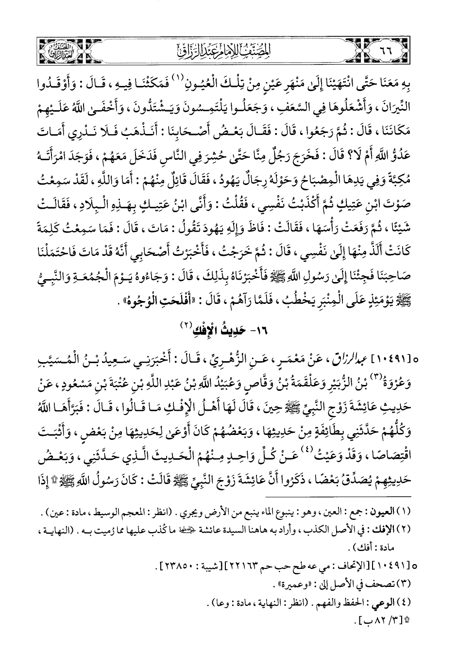 10491- عبد الرزاق، عَنْ مَعْمَرٍ، عَنِ الزُّهْرِيِّ، قَالَ: أَخْبَرَنِي سَعيدُ بن المُسَيَّبِ، وَعُرْوَةُ بن الزُّبَيْرِ، وَعَلْقَمَةُ بن وَقَّاصٍ، وَعُبَيْدُ اللهِ بن عَبدِ اللهِ بْنِ عُتْبَةَ بْنِ مَسْعُودٍ، عَن حَدِيثِ عَائِشَةَ زَوْجِ النَّبِيِّ صَلَّى اللهُ عَلَيْهِ وَسَلَّمَ، حِينَ قَالَ لَهَا أَهْلُ الإِفْكِ مَا قَالُوا، قَالَ: فَبَرَّأَهَا اللهُ، وَكُلُّهُمْ حَدَّثَنِي بِطَائِفَةٍ مِنْ حَدِيثِهَا، وَبَعْضُهُمْ كَانَ أَوْعَى لِحَدِيثِهَا مِنْ بَعْضٍ، وَأَثْبَتَ اقْتِصَاصًا، وَقَدْ وَعَيْتُ عَن كُلِّ وَاحِدٍ مِنْهُمُ الْحَدِيثَ الَّذِي حَدَّثَنِي، وَبَعْضُ حَدِيثِهِمْ يُصَدِّقُ بَعْضًا، ذَكَرُوا أَنَّ عَائِشَةَ زَوْجَ النَّبِيِّ صَلَّى اللهُ عَلَيْهِ وَسَلَّمَ قَالَتْ: كَانَ رَسُولُ اللهِ صَلَّى اللهُ عَلَيْهِ وَسَلَّمَ إِذَا أَرَادَ أَنْ يَخْرُجَ سَفَرًا، أَقْرَعَ بَيْنَ نِسَائِهِ، فَأَيَّتُهُنَّ خَرَجَ سَهْمُهَا، خَرَجَ بِهَا رَسُولُ اللهِ صَلَّى اللهُ عَلَيْهِ وَسَلَّمَ مَعَهُ، قَالَتْ عَائِشَةُ: فَأَقْرَعَ بَيْنَنَا فِي غَزَاةٍ غَزَاهَا،