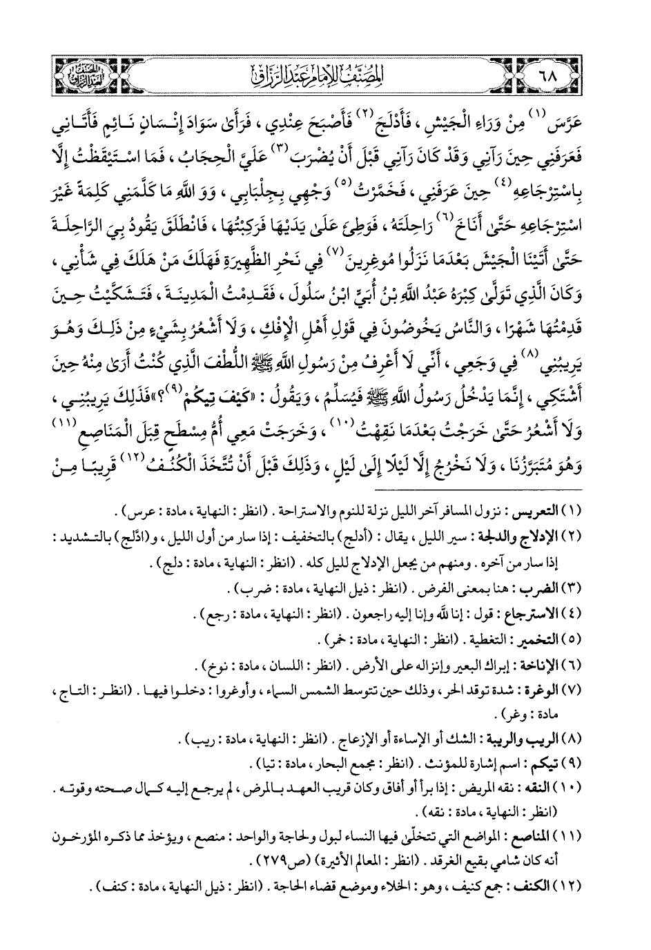 وَكَانَ الَّذِي تَوَلَّى كِبْرَهُ: عَبدُ اللهِ بْنُ أُبَيٍّ ابْنِ سَلُولَ، فَقَدِمْتُ المَدِينَةَ، فَاشْتَكَيْتُ (1) حِينَ قَدِمْتُهَا شَهْرًا، وَالنَّاسُ يَخُوضُونَ فِي قَوْلِ أَهْلِ الإِفْكِ، وَلاَ أَشْعُرُ بِشَيْءٍ مِنْ ذَلِكَ، وَهُوَ يَرِيبُنِي فِي وَجَعِي، أَنِّي لاَ أَعْرِفُ مِنْ رَسُولِ اللهِ صَلَّى اللهُ عَلَيْهِ وَسَلَّمَ اللُّطْفَ الَّذِي كُنْتُ أَرَى مِنْهُ حِينَ أَشْتَكِي، إِنَّمَا يَدْخُلُ رَسُولُ اللهِ صَلَّى اللهُ عَلَيْهِ وَسَلَّمَ، فَيُسَلِّمُ، وَيَقُولُ: كَيْفَ تِيكُمْ؟ فَذَلِكَ يَرِيبُنِي، وَلاَ أَشْعُرُ، حَتَّى خَرَجْتُ بَعْدَمَا نَقِهْتُ، وَخَرَجَتْ مَعِي أُمُّ مِسْطَحٍ قِبَلَ المَنَاصِعِ، وَهُوَ مُتَبَرَّزُنَا، وَلاَ نَخْرُجُ إِلاَّ لَيْلاً إِلَى لَيْلٍ، وَذَلِكَ قَبْلَ أَنْ نَتَّخِذَ (2) الْكُنُفُ قَرِيبًا مِنْ بُيُوتِنَا، فَانْطَلَقْتُ أَنَا وَأُمُّ مِسْطَحٍ، وَهِيَ ابْنَةُ أَبِي رُهْمِ بْنِ عَبدِ المُطَّلِبِ بْنِ عَبدِ مَنَافٍ، وَأُمُّهَا بنت (3) صَخْرِ بْنِ عَامِرٍ، خَالَةُ أَبِي بَكْرٍ الصِّدِّيقِ،