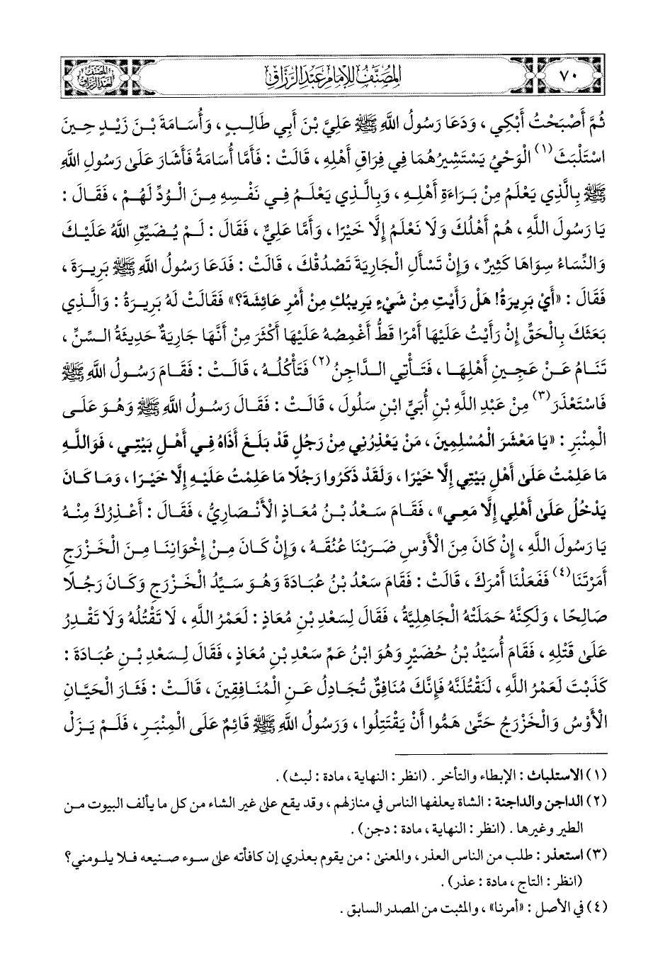فَقَامَ سَعْدُ بن مُعَاذٍ الأَنْصَارِيُّ، فَقَالَ: أَعْذِرُكَ مِنْهُ يَا رَسُولَ اللهِ، إِنْ كَانَ مِنَ الأَوْسِ ضَرَبْنَا عُنُقَهُ، وَإِنْ كَانَ مِنْ إِخْوَانِنَا مِنَ الْخَزْرَجِ أَمَرْتَنَا فَفَعَلْنَا أَمْرَكَ، قَالَتْ: فَقَامَ سَعْدُ بن عُبَادَةَ وَهُوَ سَيِّدُ الْخَزْرَجِ، وَكَانَ رَجُلاً صَالِحًا، وَلَكِنَّهُ حَمَلَتْهُ الْجَاهِلِيَّةُ، فَقَالَ لِسَعْدِ بْنِ مُعَاذٍ: لَعَمْرُ اللهِ لاَ تَقْتُلُهُ، وَلاَ تَقْدِرُ عَلَى قَتْلِهِ، فَقَامَ أُسَيْدُ بن حُضَيْرٍ، وَهُوَ ابْنُ عَمِّ سَعْدِ بْنِ مُعَاذٍ، فَقَالَ لِسَعْدِ بْنِ عُبَادَةَ: كَذَبْتَ لَعَمْرُ اللهِ لَنَقْتُلَنَّهُ، فَإِنَّكَ مُنَافِقٌ تُجَادِلُ عَنِ المُنَافِقِينَ، قَالَتْ: فَثَارَ الْحَيَّانِ: الأَوْسُ، وَالْخَزْرَجُ، حَتَّى هَمُّوا أَنْ يَقْتَتِلُوا، وَرَسُولُ اللهِ صَلَّى اللهُ عَلَيْهِ وَسَلَّمَ قَائِمٌ عَلَى المِنْبَرِ، فَلَمْ يَزَلْ يُخَفِّضُهُمْ حَتَّى سَكَتُوا، وَسَكَتَ النَّبِيُّ صَلَّى اللهُ عَلَيْهِ وَسَلَّمَ، قَالَتْ: وَمَكَثْتُ يَوْمِي ذَلِكَ، لاَ يَرْقَأُ لِي دَمْعٌ، وَلاَ أَكْتَحِلُ بِنَوْمٍ، وَأَبَوَايَ يَظُنَّانِ أَنَّ الْبُكَاءَ فَالِقٌ كَبِدِي، قَالَتْ: فَبَيْنَا هُمَا جَالِسَانِ عِنْدِي وَأَنَا أَبْكِي، اسْتَأْذَنَتْ عَلِيَّ امْرَأَةٌ، فَأَذِنْتُ لَهَا، فَجَلَسَتْ تَبْكِي مَعِي، فَبَيْنَمَا نَحْنُ عَلَى ذَلِكَ، دَخَلَ عَلَيْنَا رَسُولُ اللهِ صَلَّى اللهُ عَلَيْهِ وَسَلَّمَ، ثُمَّ جَلَسَ، قَالَتْ: وَلَمْ يَجْلِسْ عِنْدِي مُنْذُ مَا قِيلَ، وَقَدْ لَبِثَ شَهْرًا لاَ يُوحَى إِلَيْهِ، قَالَتْ: فَتَشَهَّدَ رَسُولُ اللهِ صَلَّى اللهُ عَلَيْهِ وَسَلَّمَ حِينَ جَلَسَ، ثُمَّ قَالَ: أَمَّا بَعْدُ، يَا عَائِشَةُ، فَإِنَّهُ قَدْ بَلَغَنِي عَنْكِ كَذَا وَكَذَا، فَإِنْ كُنْتِ بَرِيئَةً، فَسَيُبَرِّئُكِ اللهُ،