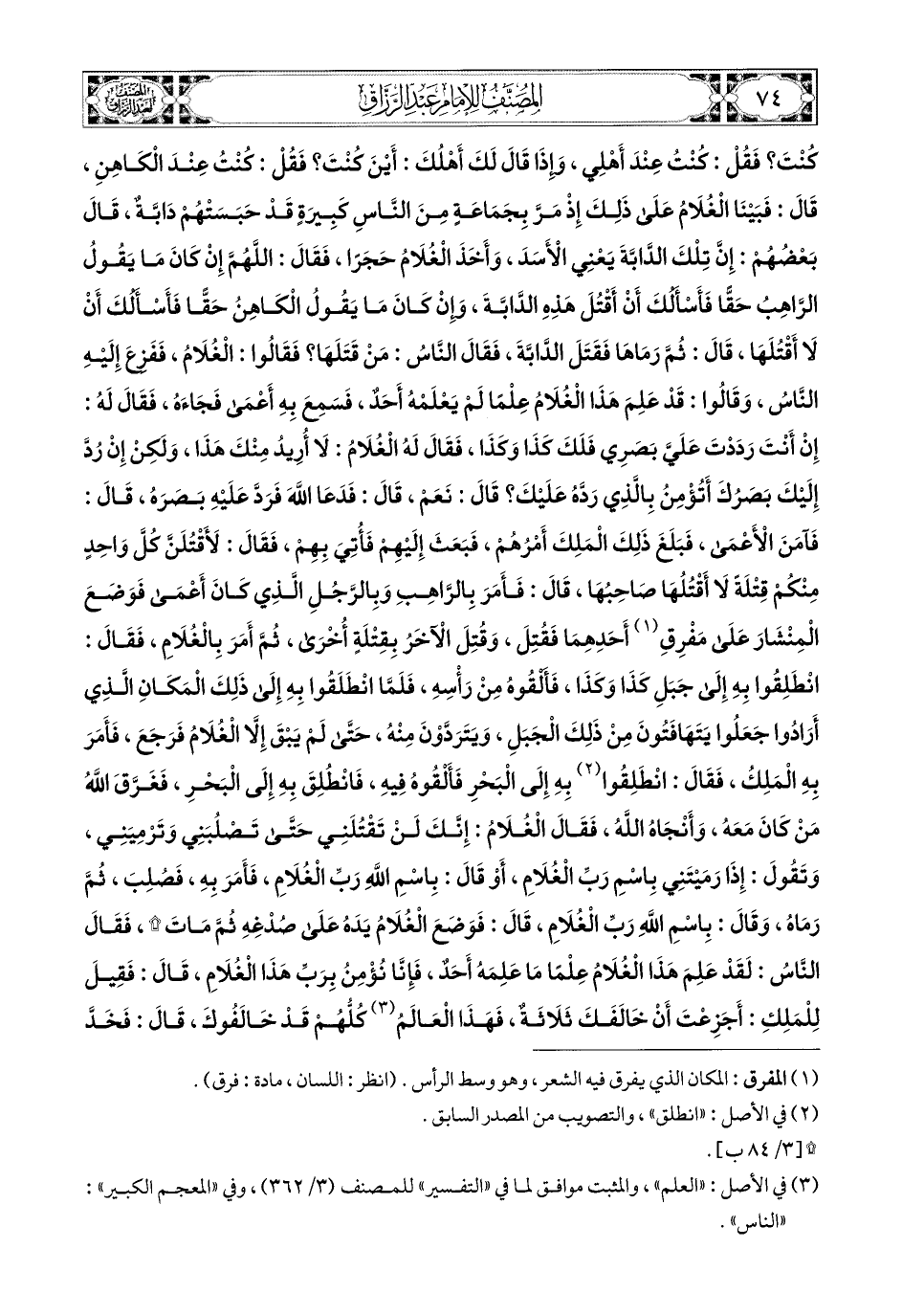 قَالَ: فَدَعَا اللهَ، فَرَدَّ عَلَيْهِ بَصَرَهُ، قَالَ: فَآمَنَ الأَعْمَى، فَبَلَغَ ذَلِكَ المَلِكَ أَمْرُهُمْ، فَبَعَثَ إِلَيْهِمْ، فَأُتِيَ بِهِمْ، فَقَالَ: لأَقْتُلَنَّ كُلَّ وَاحِدٍ مِنْكُمْ قِتْلَةً لاَ أَقْتُلَهَا صَاحِبُهَا، قَالَ: فَأَمَرَ بِالرَّاهِبِ وَبِالرِّجْلِ الَّذِي كَانَ أَعْمَى، فَوَضَعَ المِنْشَارَ عَلَى مَفْرِقِ أَحَدِهِمَا فَقُتِلَ، وَقُتِلَ الآخَرَ بِقِتْلَةٍ أُخْرَى، ثُمَّ أَمَرَ بِالْغُلاَمِ، فَقَالَ: انْطَلِقُوا بِهِ إِلَى جَبَلِ كَذَا وَكَذَا، فَأَلْقُوهُ مِنْ رَأْسَهِ، فَلَمَّا انْطَلَقُوا بِهِ إِلَى ذَلِكَ المَكَانِ الَّذِي أَرَادُوا، جَعَلُوا يَتَهَافَتُونَ مِنْ ذَلِكَ الْجَبَلِ، وَيَتَرَدَّوْنَ مِنْهُ، حَتَّى لَمْ يَبْقَ إِلاَّ الْغُلاَمُ، فَرَجَعَ، فَأَمَرَ بِهِ المَلِكُ، فَقَالَ: انْطَلِقُوا بِهِ إِلَى الْبَحْرِ، فَأَلْقُوهُ فِيهِ، فَانْطُلِقَ بِهِ إِلَى الْبَحْرِ، فَغَرَّقَ اللهُ مَنْ كَانَ مَعَهُ، وَأَنْجَاهُ اللهُ، فَقَالَ الْغُلاَمُ: إِنَّكَ لَنْ تَقْتُلَنِي حَتَّى تَصْلُبَنِي وَتَرْمِيَنِي، وَتَقُولُ إِذَا رَمَيْتَنِي: بِاسْمِ رَبِّ الْغُلاَمِ، أَوْ قَالَ: بِسْمِ اللهِ رَبِّ الْغُلاَمِ، فَأَمَرَ بِهِ فَصُلِبَ، ثُمَّ رَمَاهُ، وَقَالَ: بِسْمِ اللهِ رَبِّ الْغُلاَمِ، قَالَ: فَوَضَعَ الْغُلاَمُ يَدَهُ عَلَى صُدْغِهِ، ثُمَّ مَاتَ، فَقَالَ النَّاسُ: لَقَدْ عَلِمَ هَذَا الْغُلاَمُ عِلْمًا مَا عَلِمَهُ أَحَدٌ، فَإِنَّا نُؤْمِنُ بِرَبِّ هَذَا الْغُلاَمِ، قَالَ: فَقِيلَ لِلْمَلِكِ: أَجَزِعْتَ أَنْ خَالَفَكَ ثَلاَثَةٌ، فَهَذَا الْعَالَمُ كُلُّهُمْ قَدْ خَالَفُوكَ، قَالَ: فَخَدَّ الأُخْدُودَ، ثُمَّ أَلْقَى فِيهَا الْحَطَبَ وَالنَّارَ، ثُمَّ جَمَعَ النَّاسَ، فَقَالَ: مَنْ رَجَعَ إِلَى دِينِهِ تَرَكْنَاهُ، وَمَنْ لَمْ يَرْجِعْ أَلْقَيْنَاهُ فِي النَّارِ، فَجَعَلَ يُلْقِيهِمْ فِي تِلْكَ الأُخْدُودِ، قَالَ: فَذَلِكَ قَوْلُ اللهِ: {قُتِلَ أَصْحَابُ الأُخْدُودِ النَّارِ ذَاتِ الْوَقُودِ} حَتَّى بَلَغَ: {الْعَزِيزِ الْحَمِيدِ} قَالَ: فَأَمَّا الْغُلاَمُ فَإِنَّهُ دُفِنَ، قَالَ: فَيُذْكَرُ أَنَّهُ أُخْرِجَ فِي زَمَنِ عُمَرَ بْنِ الْخَطَّابِ رَحِمَهُ اللهُ، وَإِصْبَعَهُ عَلَى صُدْغِهِ، كَمَا كَانَ وَضَعَهَا.