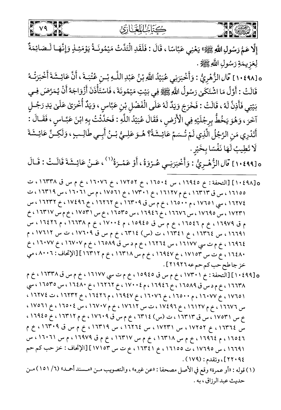 10498- قَالَ الزُّهْرِيُّ: وَأَخْبَرَنِي عُبَيْدُ اللهِ بن عَبدِ اللهِ بْنِ عُتْبَةَ، أَنَّ عَائِشَةَ أَخْبَرَتْهُ قَالَتْ: أَوَّلُ مَا اشْتَكَى رَسُولُ اللهِ صَلَّى اللهُ عَلَيْهِ وَسَلَّمَ فِي بَيْتِ مَيْمُونَةَ، فَاسْتَأْذَنَ أَزْوَاجَهُ أَنْ يُمَرَّضَ فِي بَيْتِي، فَأَذِنَّ لَهُ، قَالَتْ: فَخَرَجَ وَيَدٌ لَهُ عَلَى الْفَضْلِ بْنِ عَبَّاسٍ، وَيَدٌ أُخْرَى عَلَى يَدِ رَجُلٍ آخَرَ، وَهُوَ يَخُطُّ بِرِجْلَيْهِ فِي الأَرْضِ، فَقَالَ عُبَيْدُ اللهِ: فَحَدَّثْتُ بِهِ ابْنَ عَبَّاسٍ، فَقَالَ: أَتَدْرِي مَنِ الرَّجُلُ الَّذِي لَمْ تُسَمِّ عَائِشَةُ؟ هُوَ عَلِيُّ بن أَبِي طَالِبٍ، وَلَكِنَّ عَائِشَةَ لاَ تَطِيبُ لَهَا نَفْسًا بِخَيْرٍ.