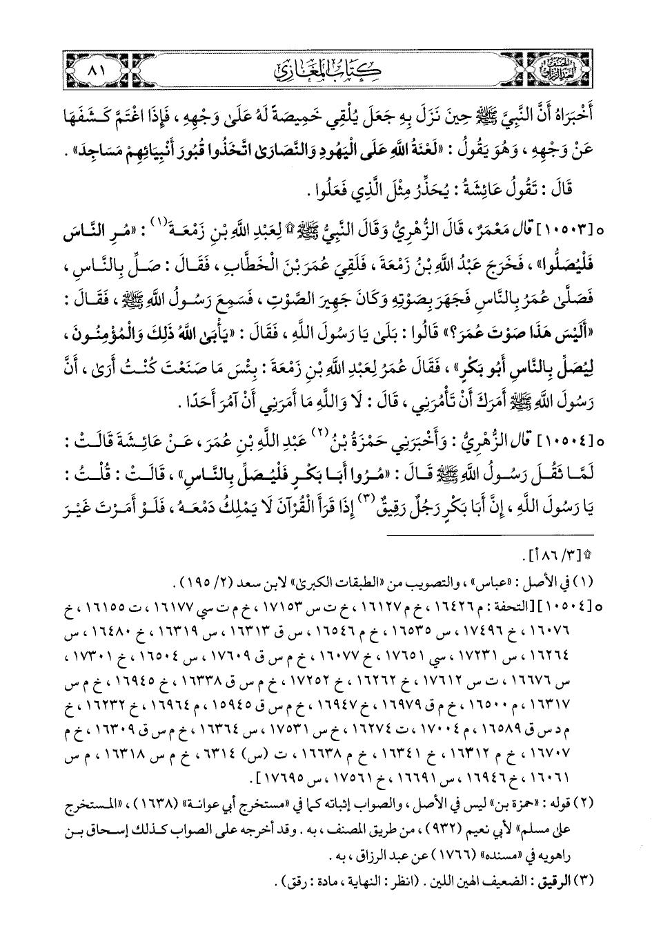 10504- قَالَ الزُّهْرِيُّ: وَأَخْبَرَنِي حَمْزَةُ بن عَبدِ اللهِ بن عُمَرَ (1)، عَنْ عَائِشَةَ، قَالَتْ: لَمَّا ثَقُلَ رَسُولُ اللهِ صَلَّى اللهُ عَلَيْهِ وَسَلَّمَ، قَالَ: مُرُوا أَبَا بَكْرٍ، فَلْيُصَلِّ بِالنَّاسِ، قَالَتْ: قُلْتُ: يَا رَسُولَ اللهِ، إِنَّ أَبَا بَكْرٍ رَجُلٌ رَقِيقٌ، إِذَا قَرَأَ الْقُرْآنَ لاَ يَمْلِكُ دَمْعَهُ، فَلَوْ أَمَرْتَ غَيْرَ أَبِي بَكْرٍ، قَالَتْ: وَاللهِ مَا بِي إِلاَّ كَرَاهِيَةَ أَنْ يَتَشَاءَمَ النَّاسُ بِأَوَّلِ مَنْ يَقُومُ فِي مَقَامِ رَسُولِ اللهِ صَلَّى اللهُ عَلَيْهِ وَسَلَّمَ، قَالَتْ: فَرَاجَعْتُهُ مَرَّتَيْنِ، أَوْ ثَلاَثًا، فَقَالَ: لِيُصَلِّ بِالنَّاسِ أَبو بَكْرٍ، فَإِنَّكُنَّ صَوَاحِبُ يُوسُفَ.