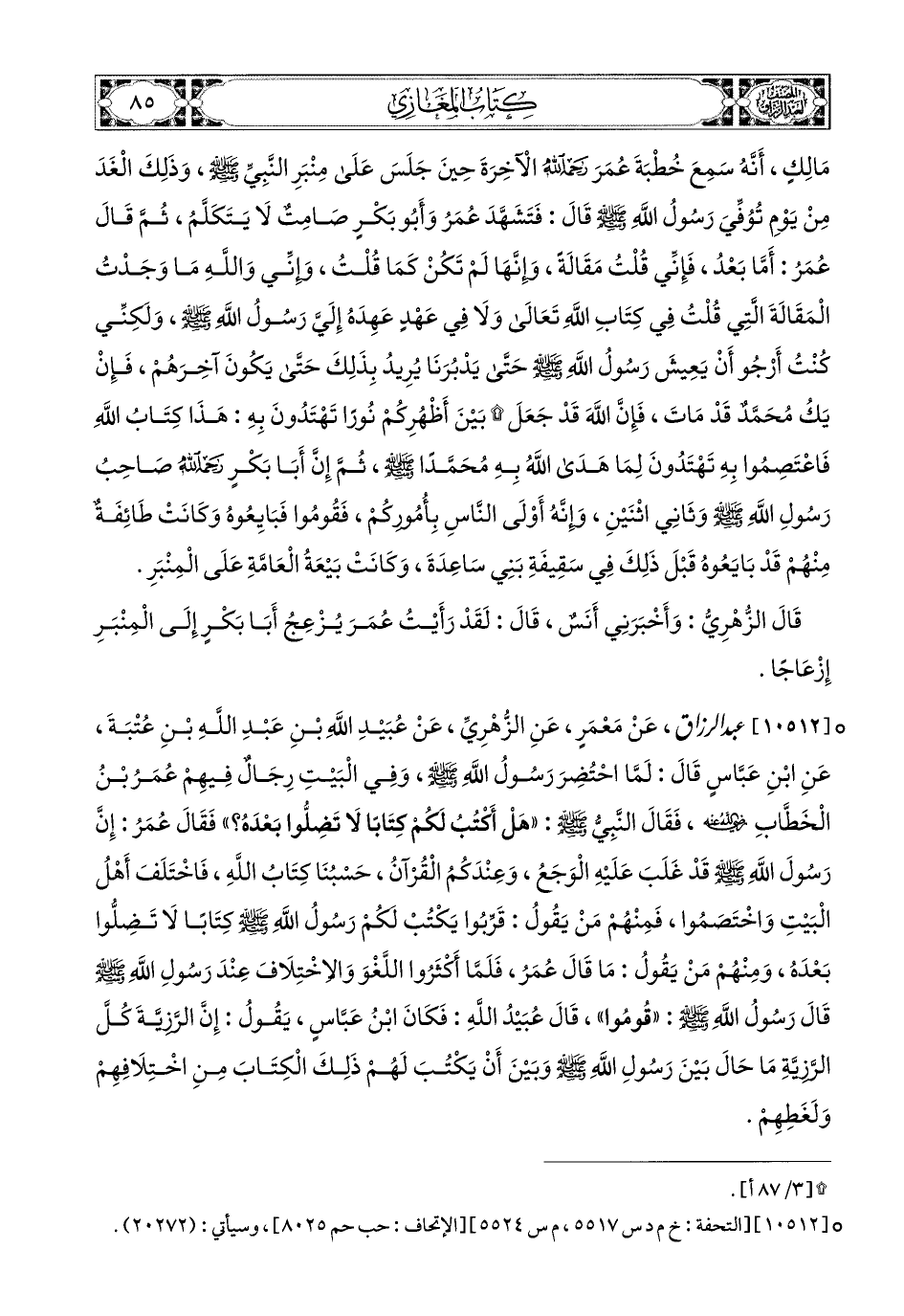 10512 - عبد الرزاق، عَنْ مَعْمَرٍ، عَنِ الزُّهْرِيِّ، عَن عُبَيْدِ اللهِ بْنِ عَبدِ اللهِ بْنِ عُتْبَةَ، عَنِ ابْنِ عَبَّاسٍ، قَالَ: لَمَّا احْتَضَرَ رَسُولُ اللهِ صَلَّى اللهُ عَلَيْهِ وَسَلَّمَ، وَفِي الْبَيْتِ رِجَالٌ، فِيهِمْ عُمَرُ بن الْخَطَّابِ رَضِيَ اللهُ عَنْهُ، فَقَالَ النَّبِيُّ صَلَّى اللهُ عَلَيْهِ وَسَلَّمَ: هَلْ أَكْتُبُ لَكُمْ كِتَابًا لاَ تَضِلُّوا بَعْدَهُ؟ فَقَالَ عُمَرُ: إِنَّ رَسُولَ اللهِ صَلَّى اللهُ عَلَيْهِ وَسَلَّمَ قَدْ غَلَبَ عَلَيْهِ الْوَجَعُ، وَعِنْدَكُمُ الْقُرْآنُ، حَسْبُنَا كِتَابُ اللهِ، فَاخْتَلَفَ أَهْلُ الْبَيْتِ وَاخْتَصَمُوا، فَمِنْهُمْ مَنْ يَقُولُ: قَرِّبُوا يَكْتُبْ لَكُمْ رَسُولُ اللهِ صَلَّى اللهُ عَلَيْهِ وَسَلَّمَ كِتَابًا، لاَ تَضِلُّوا بَعْدَهُ، وَمِنْهُمْ مَنْ يَقُولُ مَا قَالَ عُمَرُ، فَلَمَّا أَكْثَرُوا اللَّغْوَ وَالاِخْتِلاَفَ عِنْدَ رَسُولِ اللهِ صَلَّى اللهُ عَلَيْهِ وَسَلَّمَ، قَالَ رَسُولُ اللهِ صَلَّى اللهُ عَلَيْهِ وَسَلَّمَ: قُومُوا.