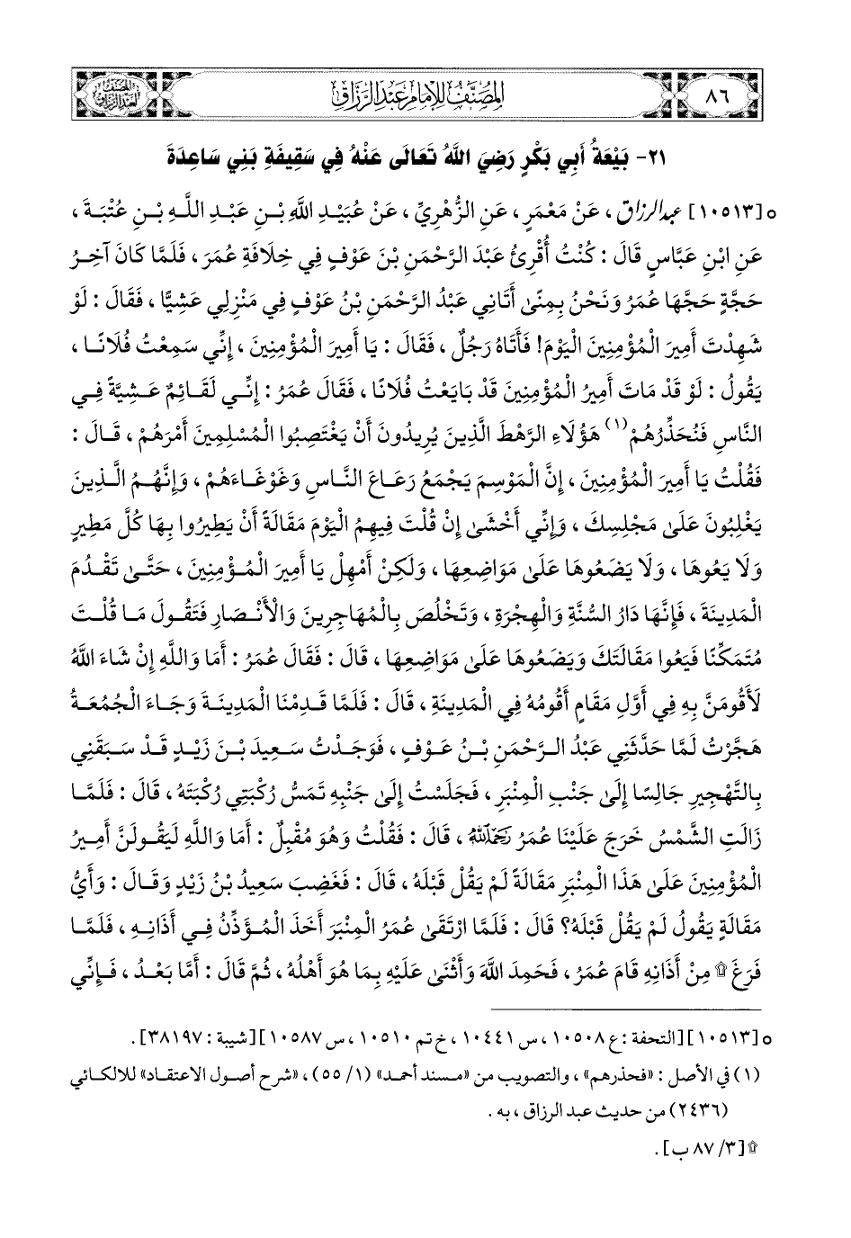 10513- عبد الرزاق، عَنْ مَعْمَرٍ، عَنِ الزُّهْرِيِّ، عَن عُبَيْدِ اللهِ بْنِ عَبدِ اللهِ بْنِ عُتْبَةَ، عَنِ ابْنِ عَبَّاسٍ، قَالَ: كُنْتُ أُقْرِئُ عَبدَ الرَّحْمَنِ بن عَوْفٍ فِي خِلاَفَةِ عُمَرَ، فَلَمَّا كَانَ آخِرُ حَجَّةٍ حَجَّهَا عُمَرُ، وَنَحْنُ بِمِنًى، أَتَانِي عَبدُ الرَّحْمَنِ بن عَوْفٍ فِي مَنْزِلِي عَشِيًّا، فَقَالَ: لَوْ شَهِدْتَ أَمِيرَ المُؤْمِنِينَ الْيَوْمَ، فأَتَاهُ (1) رَجُلٌ، فَقَالَ: يَا أَمِيرَ المُؤْمِنِينَ، إِنِّي سَمِعْتُ فُلاَنًا يَقُولُ: لَوْ قَدْ مَاتَ أَمِيرُ المُؤْمِنِينَ قَدْ بَايَعْتُ فُلاَنًا، فَقَالَ عُمَرُ: إِنِّي لَقَائِمٌ عَشِيَّةً فِي النَّاسِ، فَنُحَذِّرُهُمْ هَؤُلاَءِ الرَّهْطَ الَّذِينَ يُرِيدُونَ أَنْ يَغْتَصِبُوا المُسْلِمِينَ أَمْرَهُمْ