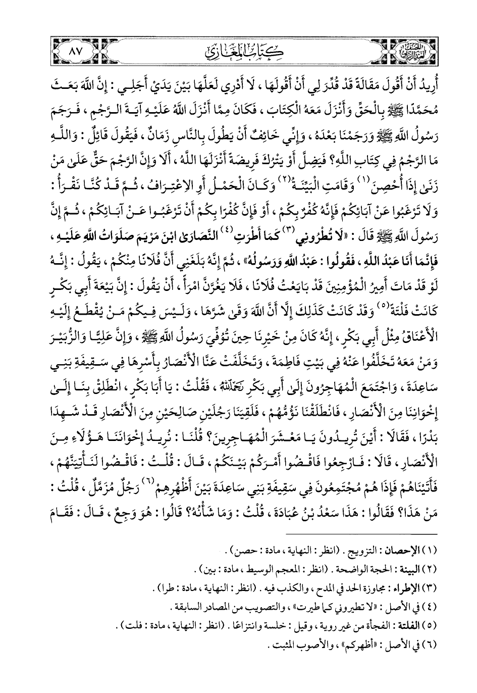 وَلَيْسَ فِيكُمْ مَنْ يُقْطَعُ إِلَيْهِ الأَعْنَاقُ مِثْلُ أَبِي بَكْرٍ، إِنَّهُ كَانَ مِنْ خَيْرِنَا حِينَ تُوُفِّيَ رَسُولُ اللهِ صَلَّى اللهُ عَلَيْهِ وَسَلَّمَ، وَإِنَّ عَلِيًّا، وَالزُّبَيْرَ وَمَنْ مَعَهُ تَخَلَّفُوا عَنْهُ فِي بَيْتِ فَاطِمَةَ، وَتَخَلَّفَتْ عَنَّا الأَنْصَارُ بِأَسْرِهَا فِي سَقِيفَةِ بَنِي سَاعِدَةَ، وَاجْتَمَعَ المُهَاجِرُونَ إِلَى أَبِي بَكْرٍ رَحِمَهُ اللهُ، فَقُلْتُ: يَا أَبَا بَكْرٍ، انْطَلَقْ بِنَا إِلَى إِخْوَانِنَا مِنَ الأَنْصَارِ، فَانْطَلَقْنَا نَؤُمُّهُمْ، فَلَقِينَا رَجُلَيْنِ صَالِحَيْنِ مِنَ الأَنْصَارِ قَدْ شَهِدَا بَدْرًا، فَقَالاَ: أَيْنَ تُرِيدُونَ يَا مَعْشَرَ المُهَاجِرِينَ؟ قُلْنَا: نُرِيدُ إِخْوَانَنَا هَؤُلاَءِ من الأَنْصَارَ، قَالاَ: فَارْجِعُوا، فَاقْضُوا أَمَرَكُمْ بَيْنَكُمْ، قَالَ: قُلْتُ: فَاقْضُوا لَنَأْتِيَنَّهُمْ، فَأَتَيْنَاهُمْ، فَإِذَا هُمْ مُجْتَمِعُونَ فِي سَقِيفَةِ بَنِي سَاعِدَةَ، بَيْنَ أَظْهُرِهِمْ رَجُلٌ مُزَمَّلٌ، قُلْتُ (1): مَنْ هَذَا؟ فَقَالُوا: هَذَا سَعْدُ بن عُبَادَةَ، قُلْتُ: وَمَا شَأْنُهُ؟ قَالُوا: هُوَ وَجِعٌ، قَالَ: فَقَامَ خَطِيبُ الأَنْصَارِ، فَحَمِدَ اللهَ وَأَثْنَى عَلَيْهِ بِمَا هُوَ أَهْلُهُ، ثُمَّ قَالَ: أَمَّا بَعْدُ،