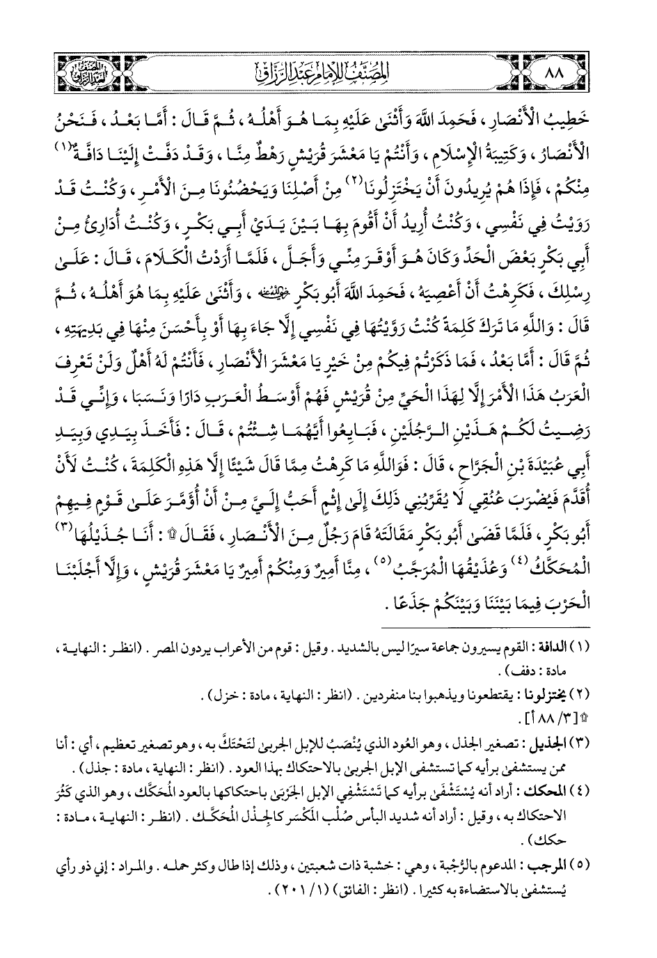 فَنَحْنُ الأَنْصَارُ، وَكَتِيبَةُ الإِسْلاَمِ، وَأَنْتُمْ يَا مَعْشَرَ قُرَيْشٍ رَهْطٌ مِنَّا، وَقَدْ دَفَّتْ إِلَيْنَا دَافَّةٌ مِنْكُمْ، فَإِذَا هُمْ يُرِيدُونَ أَنْ يَخْتَزِلُونَا مِنْ أَصْلِنَا، وَيَحْضُنُونَا مِنَ الأَمْرِ، وَكُنْتُ قَدْ رَوَّيْتُ فِي نَفْسِي، وَكُنْتُ أُرِيدُ أَنْ أَقُومَ بِهِا بَيْنَ يَدَيْ أَبِي بَكْرٍ، وَكُنْتُ أُدَارِئُ مِنْ أَبِي بَكْرٍ بَعْضَ الْحَدِّ، وَكَانَ هُوَ أَوْقَرَ مِنِّي وَأَجَلَّ، فَلَمَّا أَرَدْتُ الْكَلاَمَ، قَالَ: عَلَى رِسْلِكَ، فَكَرِهْتُ أَنْ أَعْصِيَهُ، فَحَمِدَ اللهَ أَبو بَكْرٍ رَضِي اللهُ عَنْهُ، وَأَثْنَى عَلَيْهِ بِمَا هُوَ أَهْلُهُ، ثُمَّ قَالَ: وَاللهِ مَا تَرَكَ كَلِمَةً كُنْتُ رَوَّيْتُهَا فِي نَفْسِي، إِلاَّ جَاءَ بِهَا، أَوْ بِأَحْسَنَ مِنْهَا فِي بَدِيهَتِهِ، ثُمَّ قَالَ: أَمَّا بَعْدُ، فَمَا ذَكَرْتُمْ فِيكُمْ مِنْ خَيْرٍ يَا مَعْشَرَ الأَنْصَارِ، فَأَنْتُمْ لَهُ أَهْلٌ، وَلَنْ تَعْرِفَ الْعَرَبُ هَذَا الأَمْرَ إِلاَّ لِهَذَا الْحَيِّ مِنْ قُرَيْشٍ، فَهُم أَوْسَطُ الْعَرَبِ دَارًا وَنَسَبَا، وَإِنِّي قَدْ رَضِيتُ لَكُمْ هَذَيْنِ الرَّجُلَيْنِ، فَبَايِعُوا أَيَّهُمَا شِئْتُمْ، قَالَ: فَأَخَذَ بِيَدِي، وَبِيَدِ أَبِي عُبَيْدَةَ بْنِ الْجَرَّاحِ،