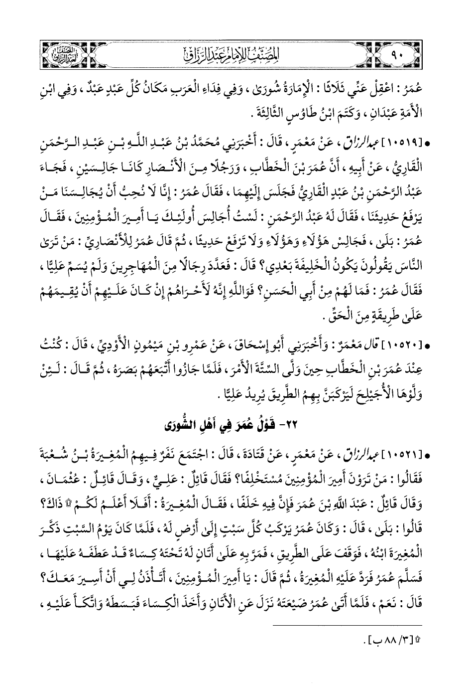 10519- عبد الرزاق، عَنْ مَعْمَرٍ، قَالَ: أَخْبَرَنِي مُحَمَّدُ بن عَبدِ اللهِ بْنِ عَبدِ الرَّحْمَنِ الْقَارِيُ، عَنْ أَبِيهِ، أَنَّ عُمَرَ بن الْخَطَّابِ، وَرَجُلاً مِنَ الأَنْصَارِ كَانَا جَالِسَيْنِ، فَجَاءَ عَبدُ الرَّحْمَنِ بن عَبدٍ الْقَارِيُ، فَجَلَسَ إِلَيْهِمَا، فَقَالَ عُمَرُ: إِنَّا لاَ نُحِبُّ أَنْ يُجَالِسَنَا مَنْ يَرْفَعُ حَدِيثَنَا، فَقَالَ لَهُ عَبدُ الرَّحْمَنِ: لَسْتُ أُجَالِسُ أُولَئِكَ يَا أَمِيرَ المُؤْمِنِينَ، فَقَالَ عُمَرُ: بَلَى، فَجَالِسْ هَؤُلاَءِ وَهَؤُلاَءِ، وَلاَ تَرْفَعْ حَدِيثًا، ثُمَّ قَالَ عُمَرُ لِلأَنْصَارِيِّ: مَنْ تَرَى النَّاسَ يَقُولُونَ يَكُونُ الْخَلِيفَةَ بَعْدِي؟ قَالَ: فَعَدَّدَ رِجَالاً مِنَ المُهَاجِرِينَ، وَلَمْ يُسَمِّ عَلِيًّا، فَقَالَ عُمَرُ: فَمَا لَهُمْ مِنْ أَبِي الْحَسَنِ؟ فَوَاللهِ إِنَّهُ لأَحْرَاهُمْ، إِنْ كَانَ عَلَيْهِمْ أَنْ يُقِيمَهُمْ عَلَى طَرِيقَةٍ مِنَ الْحَقِّ.