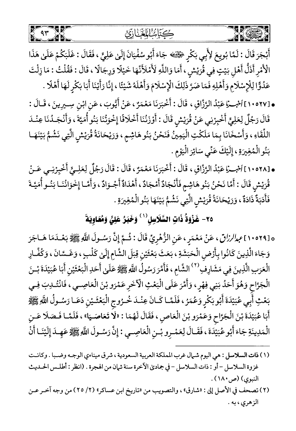 10529- عبد الرزاق، عَنْ مَعْمَرٍ، عَنِ الزُّهْرِيِّ، قَالَ: ثُمَّ إِنَّ رَسُولَ اللهِ صَلَّى اللهُ عَلَيْهِ وَسَلَّمَ بَعْدَ مَا هَاجَرَ وَجَاءَ الَّذِينَ كَانُوا بِأَرْضِ الْحَبَشَةِ، بَعَثَ بَعْثَيْنِ قِبَلَ الشَّامِ إِلَى كَلْبٍ، وَغَسَّانَ، وَكُفَّارِ الْعَرَبِ الَّذِينَ فِي مَشَارِفِ الشَّامِ، فَأَمَّرَ رَسُولُ اللهِ صَلَّى اللهُ عَلَيْهِ وَسَلَّمَ عَلَى أَحَدِ الْبَعْثَيْنِ أَبَا عُبَيْدَةَ بن الْجَرَّاحِ، وَهُوَ أَحَدُ بَنِي فِهْرٍ، وَأَمَّرَ عَلَى الْبَعْثِ الآخَرِ: عَمْرَو بن الْعَاصِ، فَانْتَدَبَ فِي بَعَثِ أَبِي عُبَيْدَةَ: أَبو بَكْرٍ، وَعُمَرُ، فَلَمَّا كَانَ عِنْدَ خُرُوجِ الْبَعْثَيْنِ، دَعَا رَسُولُ اللهِ صَلَّى اللهُ عَلَيْهِ وَسَلَّمَ أَبَا عُبَيْدَةَ بن الْجَرَّاحِ، وَعَمْرَو بن الْعَاصِ، فَقَالَ لَهُمَا: لاَ تَعَاصَيَا، فَلَمَّا فَصَلاَ عَنِ المَدِينَةِ، جَاءَ أَبو عُبَيْدَةَ، فَقَالَ لِعَمْرِو بنِ الْعَاصِ: إِنَّ رَسُولَ اللهِ صَلَّى اللهُ عَلَيْهِ وَسَلَّمَ عَهِدَ إِلَيْنَا أَنْ لاَ نَتَعَاصَيَا، فَإِمَّا أَنْ تُطِيعَنِي، وَإِمَّا أَنْ أُطِيعَكَ،