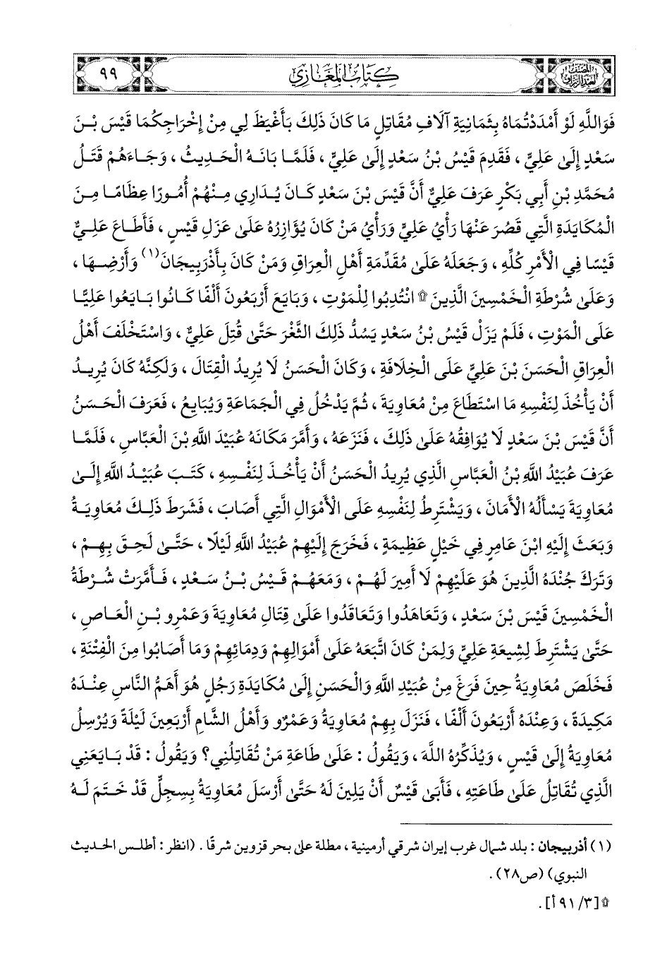 فَخَرَجَ إِلَيْهِمْ عُبَيْدُ اللهِ لَيْلاً، حَتَّى لَحِقَ بِهِمْ، وَتَرَكَ جُنْدَهُ، الَّذِينَ هُوَ عَلَيْهِمْ، لاَ أَمِيرَ لَهُمْ، وَمَعَهُمْ قَيْسُ بن سَعْدٍ، فَأَمَّرَتْ شُرْطَةُ الْخَمْسِينَ قَيْسَ بن سَعْدٍ، وَتَعَاهَدُوا، وَتَعَاقَدُوا عَلَى قِتَالِ مُعَاوِيَةَ، وَعَمْرِو بنِ الْعَاصِ، حَتَّى يَشْتَرِطَ لِشِيعَةِ عَلِيٍّ وَلِمَنْ كَانَ اتَّبَعَهُ عَلَى أَمْوَالِهِمْ وَدِمَائِهِمْ وَمَا أَصَابُوا مِنَ الْفِتْنَةِ، فَخَلَصَ مُعَاوِيَةُ حِينَ فَرَغَ مِنْ عُبَيْدِ اللهِ وَالْحَسَنِ إِلَى مُكَايَدَةِ رَجُلٍ هُوَ أَهَمُّ النَّاسِ عِنْدَهُ مَكِيدَةً، وَعِنْدَهُ أَرْبَعُونَ أَلْفًا، فَنَزَلَ بِهِمْ مُعَاوِيَةُ وَعَمْرٌو وَأَهْلُ الشَّامِ أَرْبَعِينَ لَيْلَةً، وَيُرْسِلُ مُعَاوِيَةُ إِلَى قَيْسٍ وَيُذَكِّرُهُ اللهَ، وَيَقُولُ: عَلَى طَاعَةِ مَنْ تُقَاتِلُنِي؟ وَيَقُولُ: قَدْ بَايَعَنِي الَّذِي تُقَاتِلُ عَلَى طَاعَتِهِ، فَأَبَى قَيْسٌ أَنْ يَلِينَ لَهُ، حَتَّى أَرْسَلَ مُعَاوِيَةُ بِسِجِلٍّ قَدْ خَتَمَ لَهُ فِي أَسْفَلِهِ، فَقَالَ: اكْتُبْ فِي هَذَا السِّجِلِّ، فَمَا كَتَبْتَ فَهُوَ لَكَ، فَقَالَ عَمْرٌو لِمُعَاوِيَةَ: لاَ تُعْطِهِ هَذَا وَقَاتِلْهُ، فَقَالَ مُعَاوِيَةُ، وَكَانَ خَيْرَ الرَّجُلَيْنِ: عَلَى رِسْلِكَ يَا أَبَا عَبدِ اللهِ، فَإِنَّا لَنْ نَخْلُصَ إِلَى قَتَلِ هَؤُلاَءِ، حَتَّى يُقْتَلَ عَدَدُهُمْ مِنْ أَهْلِ الشَّامِ، فَمَا خَيْرُ الْحَيَاةِ بَعْدَ ذَلِكَ؟ وَإِنِّي وَاللهِ لاَ أُقَاتِلُهُ، حَتَّى لاَ أَجِدَ مِنْ ذَلِكَ بُدًّا، فَلَمَّا بَعَثَ إِلَيْهِ مُعَاوِيَةُ بِذَلِكَ السِّجِلَّ، اشْتَرَطَ قَيْسُ بن سَعْدٍ لِنَفْسِهِ وَلِشِيعَةِ عَلِيٍّ الأَمَانَ عَلَى مَا أَصَابُوا مِنَ الدِّمَاءِ وَالأَمْوَالِ، وَلَمْ يَسْأَلْ مُعَاوِيَةَ فِي ذَلِكَ مَالاً، فَأَعْطَاهُ مُعَاوِيَةُ مَا اشْتَرَطَ عَلَيْهِ، وَدَخَلَ قَيْسٌ وَمَنْ مَعَهُ فِي الْجَمَاعَةِ.