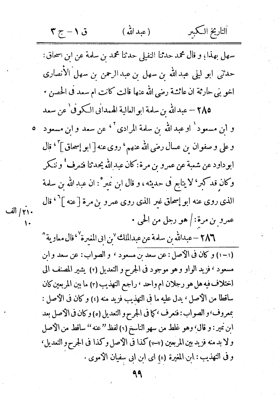 (1) وهو عبد الله بن محمد بن عبد الله بن جعفر بن اليمان بن اخنس بن خنيس الجعفي البخاري الحافظ المعروف بالمسندى سمى بذلك لانه كان يطلب المسندات ويرغب عن المرسلات، وقال الحاكم: سمى المسندى لانه اول من جمع مسند الصحابة بما وراء النهر، روى عنه البخاري، ومن التهذيب (2) هو هاشم بن القاسم بن مسلم بن مقسم الليثى أبو النضر البغدادي الحافظ الخراساني ولقبه قيصر، كما هو في التهذيب ج 11 ص 18 (3) هو شيبان بن عبد الرحمن (4) وعن ابيه، ذكره ابن ابى حاتم وزاد في رواته: شريكا وعمر بن ابى زائدة (5) وأبيه الجرح والتعديل.