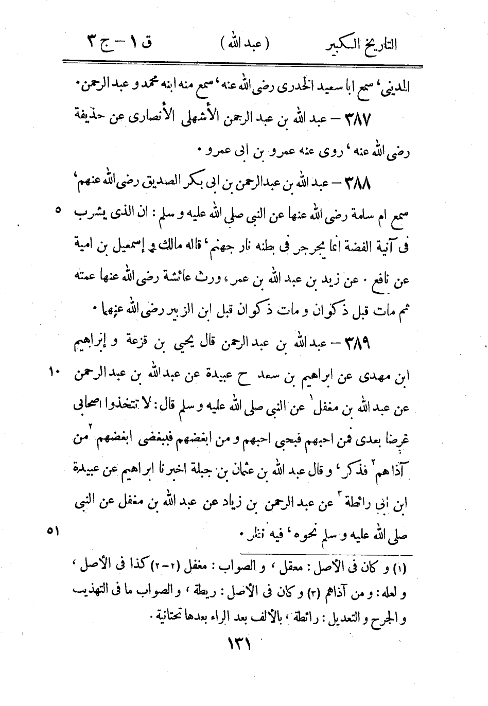 412 - عبد الله بن عبيد الله بْن أَبِي مليكة أَبُو بكر الْقُرَشِيّ التيمي الأحول وكَانَ قاضيا على عهد ابْن الزبير، سَمِعَ ابْن عَبَّاس وابْن الزبير وعَائِشَة رَضِيَ الله عَنْهُم، هو الْمَكِّيّ، وقَالَ الْحَسَن بْن الربيع حَدَّثَنَا عَبْد الجبار بْن الورد، كنيته أَبُو محمد، محمد بن سعيد قال اخ يَحْيَى بْن اليمان عَنْ سُفْيَان عَنِ ابْن جريج عَنِ ابْن أبي مليكة: أدركت ثلاثين مِنْ أَصْحَابِ النَّبِيِّ صَلَّى اللَّهُ عَلَيْهِ وَسَلَّمَ كلهم يخاف النفاق على نفسه ما منهم أحد يَقُولُ إنَّهُ على إيمان جبريل وميكائيل.