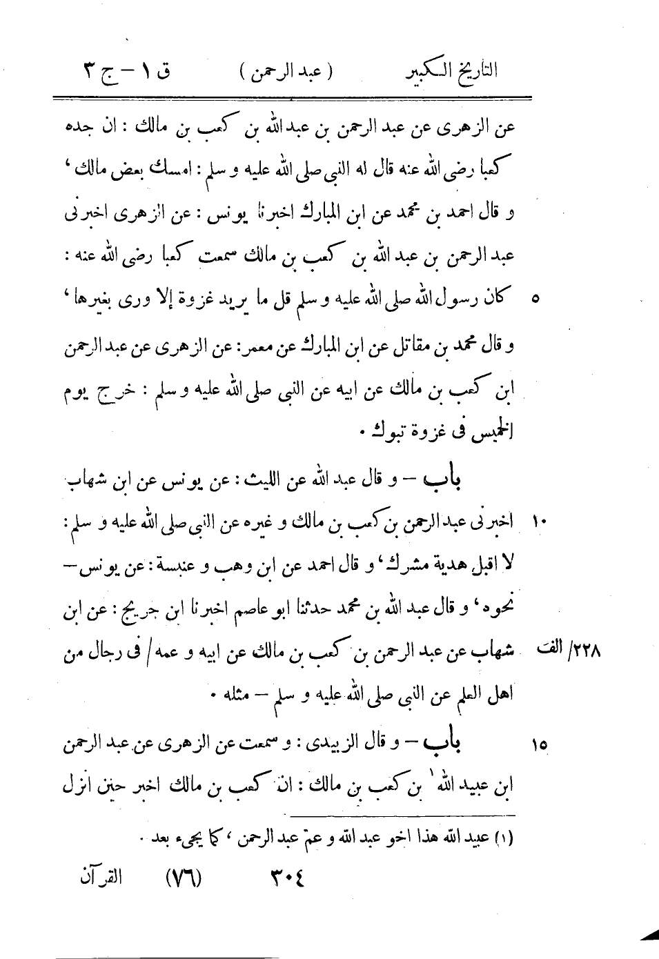 باب - وَقَالَ عَبْد اللَّه عَنِ اللَّيْثِ عَنْ عقِيلَ: عَنِ ابْن شِهَابٍ قال أخبرني عَبْد اللَّه بْن كعب بْنِ مَالِكٍ السُّلَمِيِّ - 1: أَنّ النَّبِيَّ صَلَّى اللَّهُ عَلَيْهِ وَسَلَّمَ نَهَى الَّذِينَ قَتَلُوا ابْنَ أَبِي الْحَقِيقِ عَنْ قَتْلِ النِّسَاءِ وَالْوِلْدَانِ، وَقَالَ أَحْمَدُ عن عنبسة: عَنْ يُونُسَ عَنِ ابْنِ شِهَابٍ عَنْ عَبْدِ الرَّحْمَن بْن كعب بْن مالك: عَنْ أَبِيهِ: نَهَى النَّبِيُّ صَلَّى اللَّهُ عَلَيْهِ وَسَلَّمَ عَنِ قَتْلِ النِّسَاءِ وَالصِّبْيَانِ، وقَالَ نعيم عَنِ ابْن المبارك: عَنْ يونس - ولم يقل: عن ابيه، وقال ابن يوسف اخ مالك: عَنِ ابْن شهاب عَنِ ابْن كعب بْن مالك - قَالَ مالك: أحسبه عَبْد الرَّحْمَن -: نَهَى النَّبِيُّ صَلَّى اللَّهُ عَلَيْهِ وَسَلَّمَ - مثلَهُ، وقَالَ يوسف بْن بُهْلُولَ حَدَّثَنَا ابْن إدريس عن ابن اسحاق: حدثنى الزهري عن عبيد الله بْن كعب بْنِ مَالِكٍ عَنِ النَّبِيِّ صَلَّى اللَّهُ عَلَيْهِ وَسَلَّمَ - نحوه، وقَالَ مُوسَى عَنْ إِبْرَاهِيم بْن سعد: أَخْبَرَنَا ابْن شهاب عَنْ عَبْد الرَّحْمَن بْن عَبْد اللَّه بْن كعب بْنِ مَالِكٍ: أَنَّ النَّبِيَّ صَلَّى اللَّهُ عَلَيْهِ وَسَلَّمَ بَعَثَ إلى ابن أَبِي الحقيق، وقَالَ ابْن عيينة: حَدَّثَنَا الزُّهْرِيّ أَخْبَرَنِي ابْن كعب بْن مالك: عَنْ عمه: نهى النَّبِيّ صَلَّى اللَّهُ عَلَيْهِ وَسَلَّمَ، وقَالَ