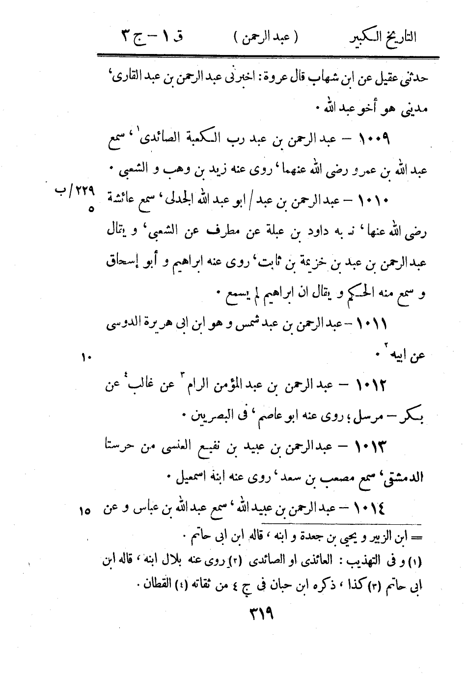 (1) أي اسمعيل بن عياش (2) أي صفوان بن عمرو (3) أي كان عبد الرحمن من حملة العلم، ولعله سقط من الاصل (4) وكان في الاصل: عويمر، والصواب: عويم، راجع اسد الغابة ج 3 ص 317 (5) وفى اسد الغابة: بمخرج رسول الله صلى الله عليه وسلم كنا نخرج كل غداة إلى ظهر الحرة - الخ، وقال فيه: ولد قبل الهجرة (6) هو من رجال التهذيب، ذكر في الكنى.