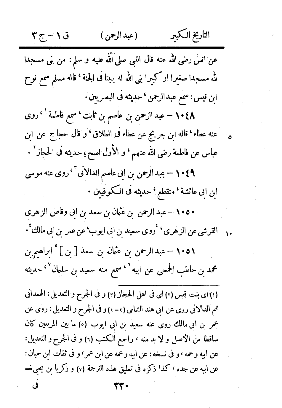 (1) أي مبشر بن اسمعيل (2) بكسر المهملة وسكون الراء بعدها قاف، كذا في التقريب (3) أي جابر بن عتيك ومحمد بن جابر بن عبد الله (4) أي ابن اسمعيل وسليمان بن بلال وداود بن قيس، قاله ابن ابى حاتم (5) أي المقدام ابن معديكرب (6) كذا في الاصل، والقرائن تدل على ان من هنا سقطت العبارة من الوسائط اعني اول السند - والله اعلم (7) وكان في الاصل: سيار، خطأ، راجع كتب الرجال.