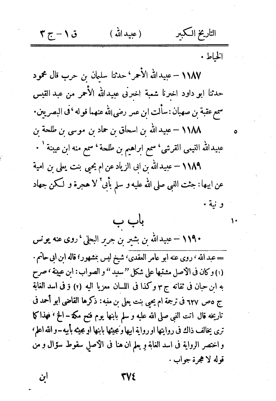 راجع التقريب (2) وكان في الاصل: الاحبى، سقط الراء منه، وفى الثقات: الازدي، تحريف، والصواب: الارحبي، والارحب بطن من همدان (3) وكان في الاصل: قال، وفوقه " عن " علامة للنسخة، والصواب: عن، لان عبيد الله يروى عن صفوان (4) أي هشام بن حسان، قاله ابن ابى حاتم (5) كذا في الاصل، ولعله تصحيف عبيد الله أو يشير إلى اختلاف في اسمه - والله اعلم.