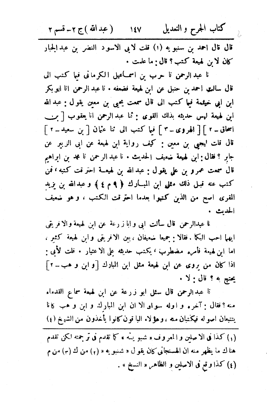حَدَّثنا عَبد الرَّحمن، قال: سُئِل أَبو زُرعَة عَن ابن لَهيعَة، سماع القدماء منه؟ فقال: آخره وأوله سواء إِلاَّ أن ابن المبارك، وابن وهب كانا يتتبعان أصوله فيكتبان منه، وهؤلاء الباقون كانوا يأخذون من الشيخ، وكان ابن لَهيعَة لا يضبط، وليس ممن يُحتَج بِحَديثه، من أجمل القول فيه.