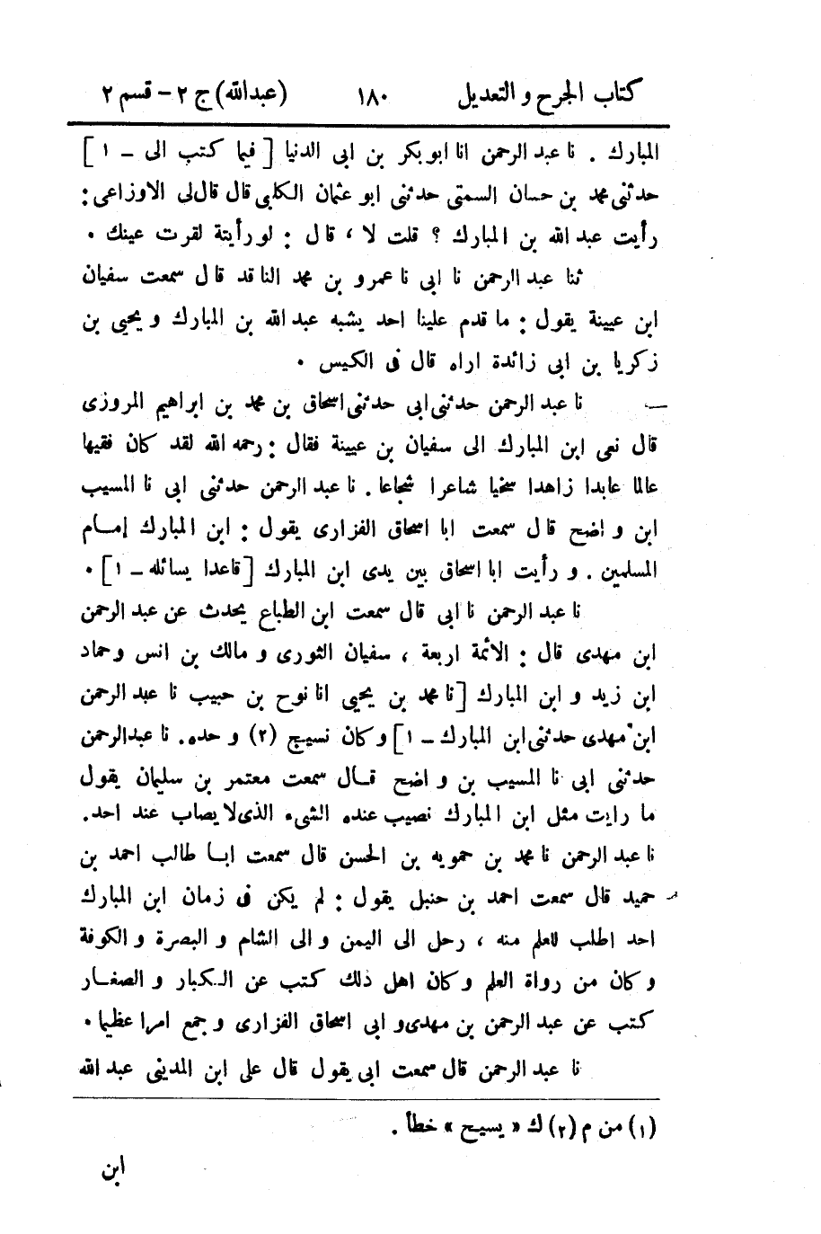 حَدَّثنا عَبد الرَّحمن، حَدَّثنا أَبي، قال: سَمِعتُ ابن الطباع يحدث عن عَبد الرَّحمن بن مهدي، قال: الأَئِمة أربعة: سُفيان الثَّوري، ومالك بن أَنس، وحَمَّاد بن زيد، وابن المبارك.
