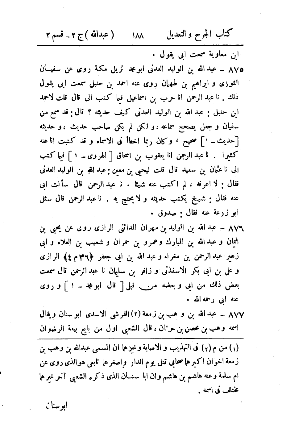 حَدَّثنا عَبد الرَّحمن، أَخبَرنا حرب بن إِسماعيل، فيما كَتَبَ إلَيَّ، قال: قلت لأَحمد ابن حَنبل: عَبد الله بن الوليد العدني، كيف حديثه؟ قال: قد سمع من سُفيان، وجعل يصحح سماعه، ولكن لم يكن صاحب حديث، وحديثه حديث صحيح، وكان ربما أخطأ في الأسماء، وقد كتبت أَنا عنه كثيرًا.