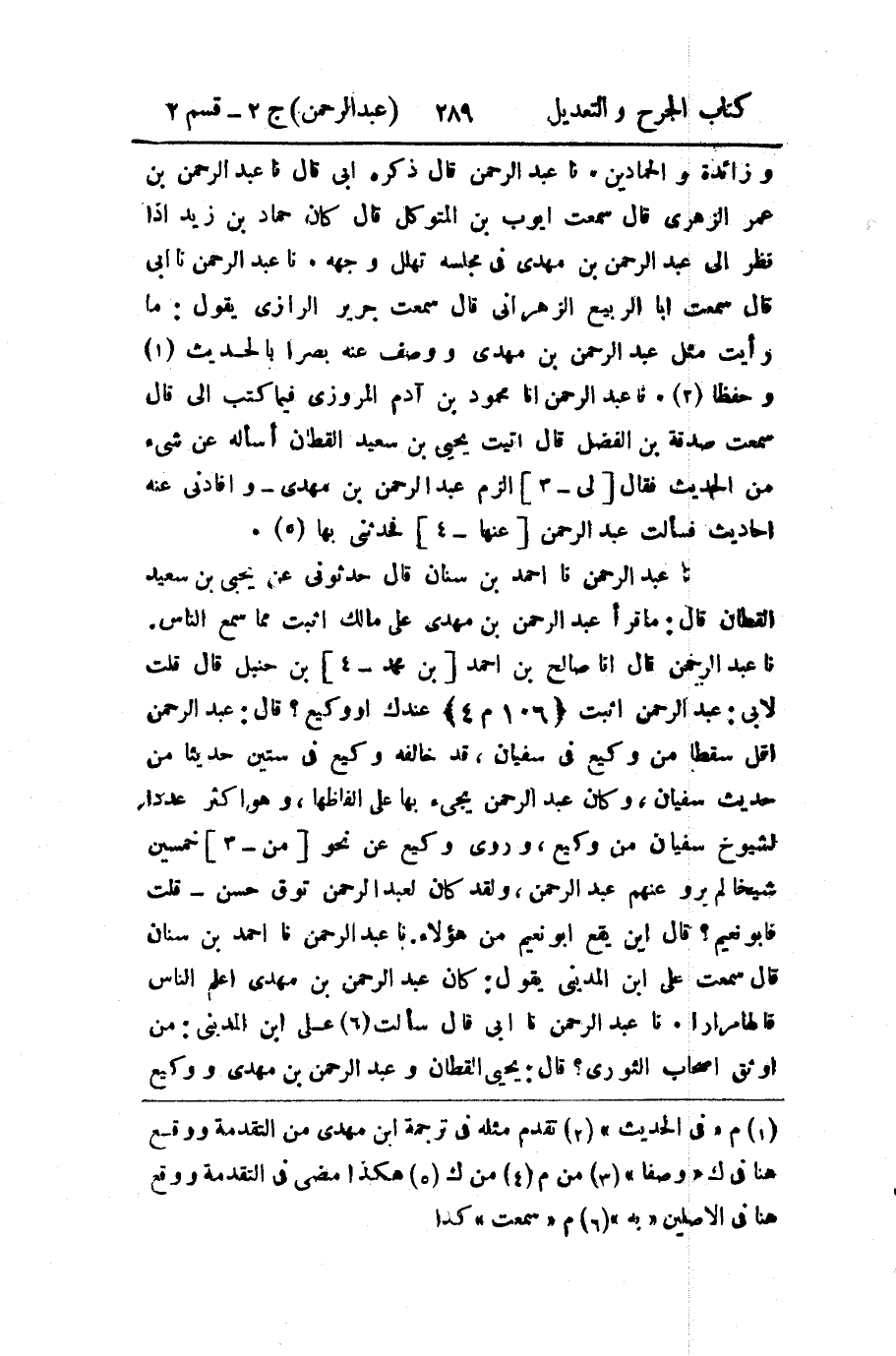 حَدَّثنا عَبد الرَّحمن، حَدَّثنا أَحمد بن سنان، قال: سَمِعتُ عَلي بن المَديني يقول: كان عَبد الرَّحمن بن مهدي أعلم الناس، قالها مرارا.