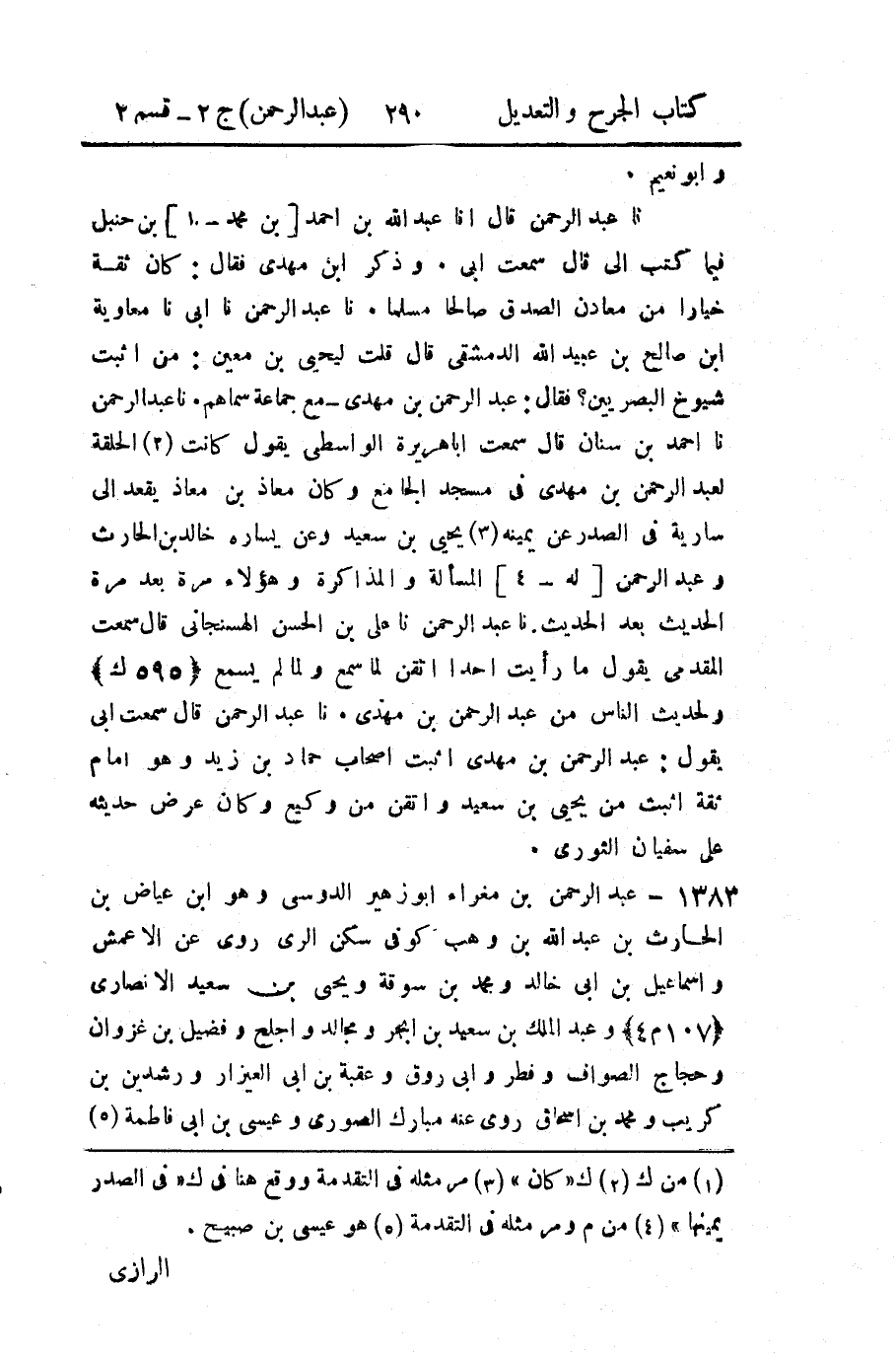 حَدَّثنا عَبد الرَّحمن، حَدَّثنا أَبي، حَدَّثنا معاوية بن صالح بن عُبَيد الله الدمشقي، قال: قلتُ ليحيى بن مَعين: من أثبت شيوخ البصريين؟ فقال: عَبد الرَّحمن بن مهدي، مع جماعة سماهم.