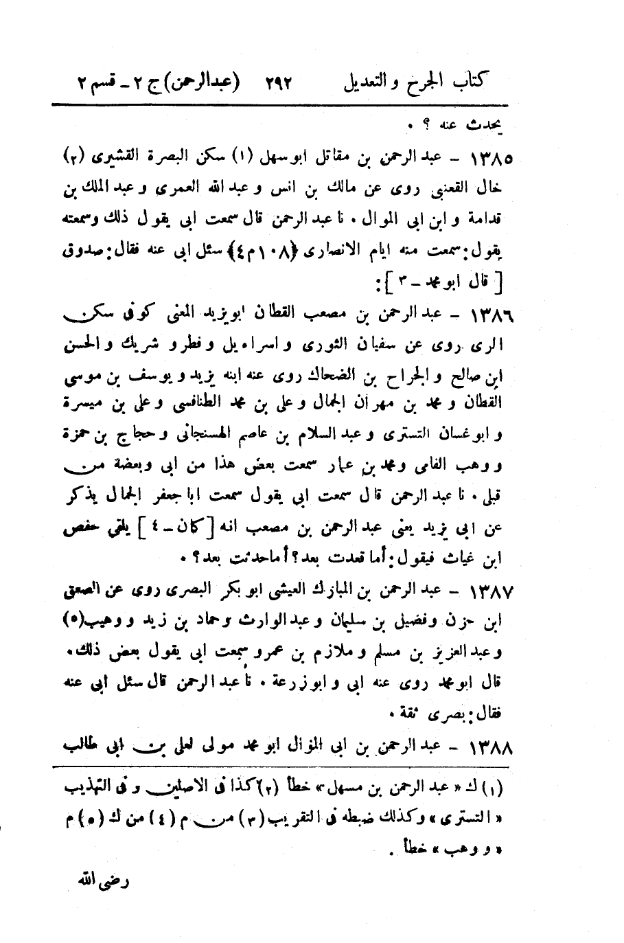 1385- عَبد الرَّحمن بن مقاتل، أَبو سهل سكن البصرة القشيري خال القَعنَبي.