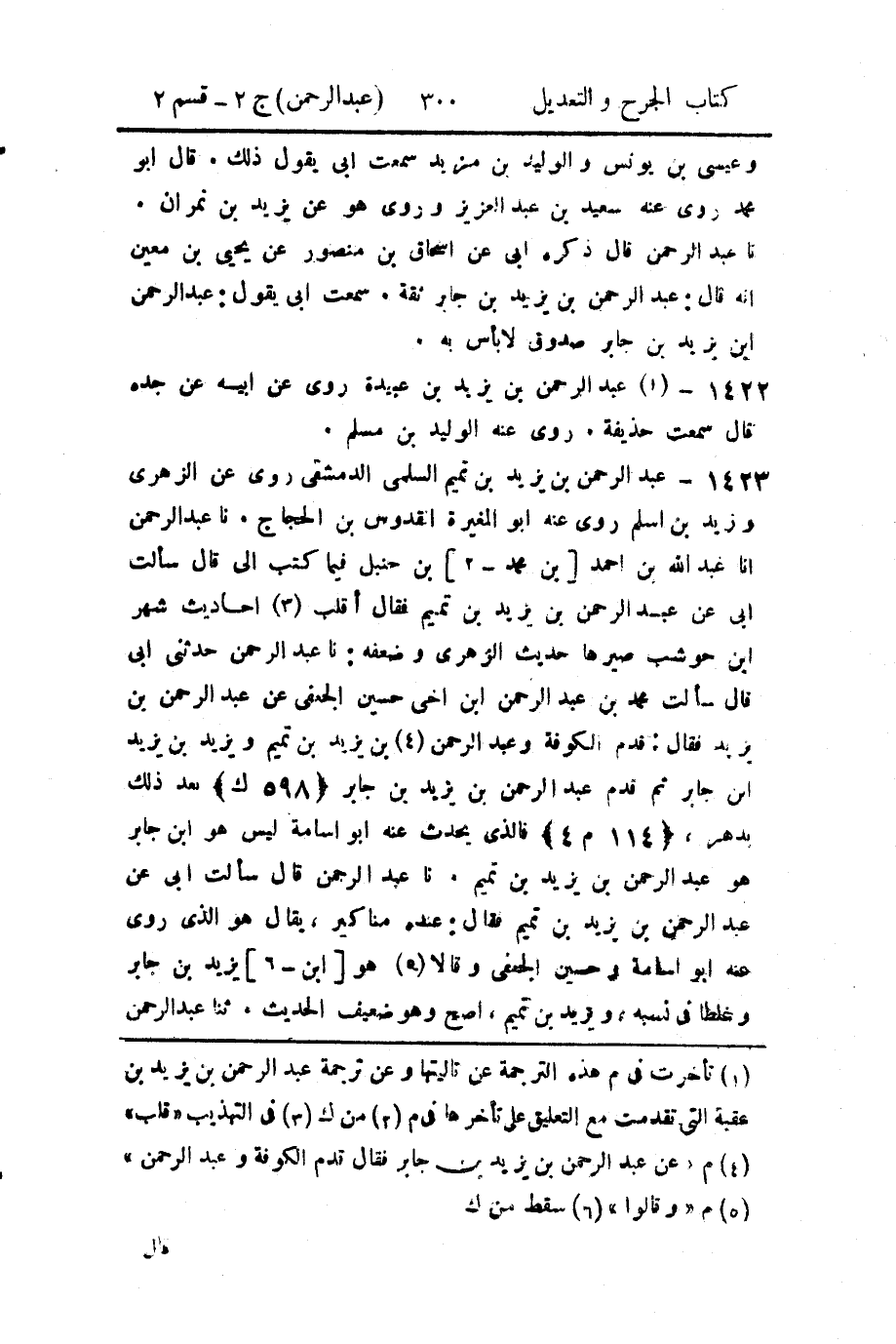 حَدَّثنا عَبد الرَّحمن، حدثني أَبي، قال: سألتُ محمد بن عَبد الرَّحمن بن أَخي حسين الجعفي عن عَبد الرَّحمن بن يزيد فقال: قدم الكوفة، وعَبد الرَّحمن بن يزيد بن تميم، ويزيد بن يزيد بن جابر، ثم قدم عَبد الرَّحمن بن يزيد بن جابر بعد ذلك بدهر، فالذي يحدث عنه أَبو أُسامة ليس هو ابن جابر، هو عَبد الرَّحمن بن يزيد بن تميم.
