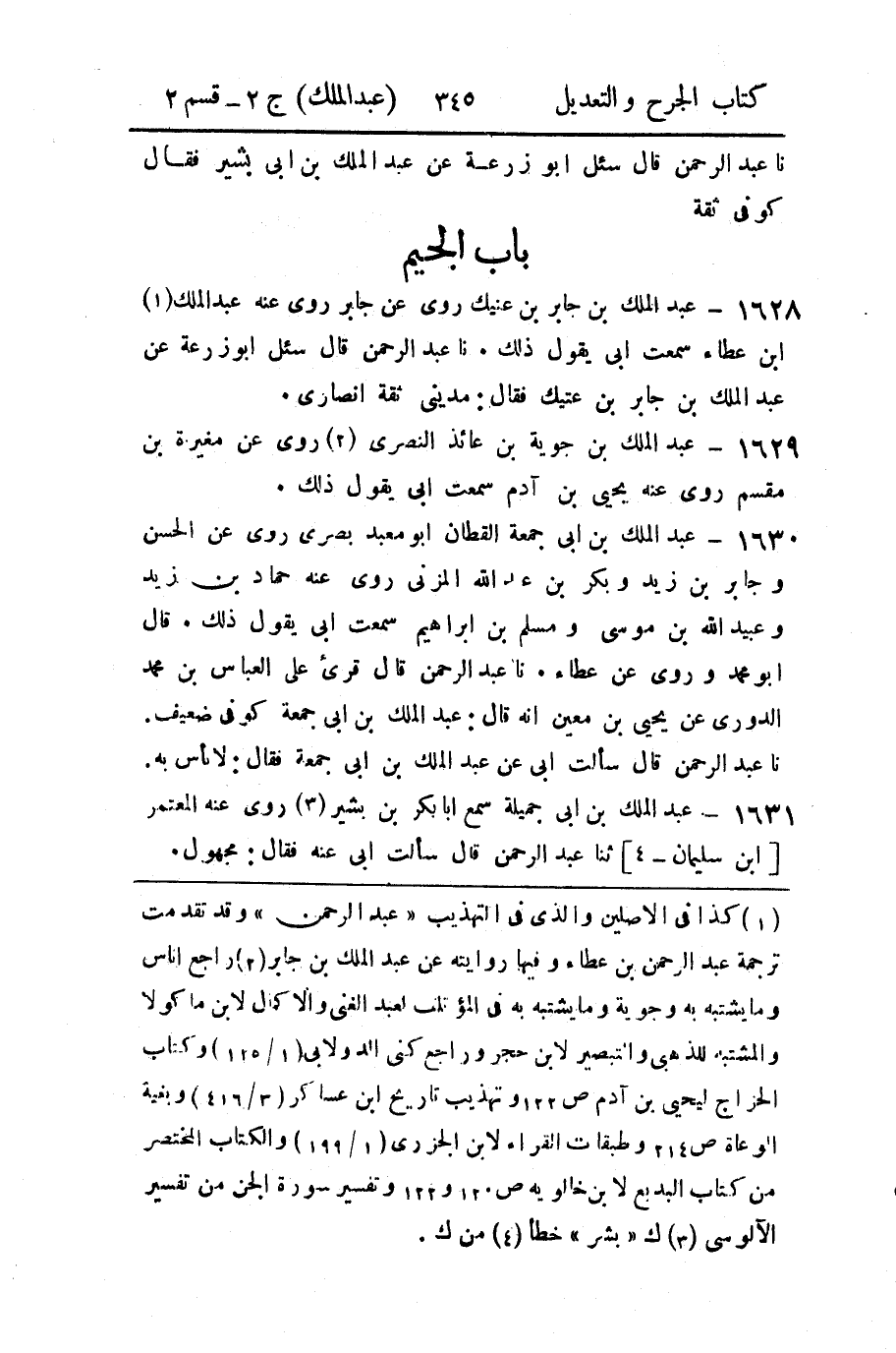 حَدَّثنا عَبد الرَّحمن، قال: سُئِل أَبو زُرعَة عن عَبد الملك بن جابر بن عتيك، فقال: مَدينيٌّ ثقة أَنصاري.