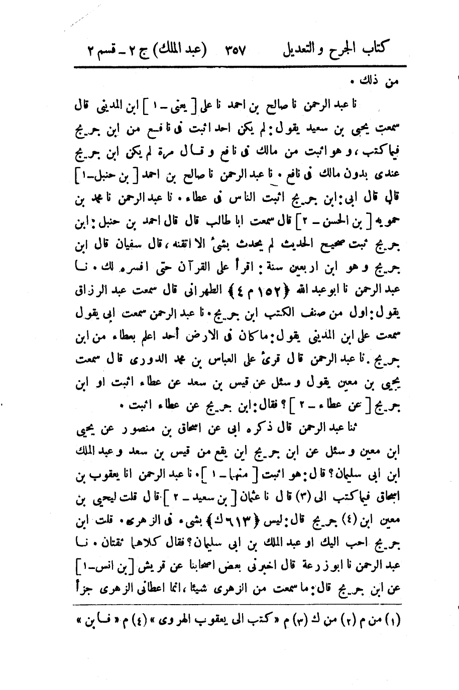 حَدَّثنا عَبد الرَّحمن، أَخبَرنا يعقوب بن إِسحاق، فيما كَتَبَ إِلَيَّ، قال: حَدَّثنا عثمان بن سعيد، قال: قلتُ ليحيى بن مَعين: ابن جُرَيج؟ قال: ليس بِشيءٍ في الزُّهْري، قلتُ: ابن جُرَيج أَحَب إليك، أَو عَبد الملك بن أَبي سليمان؟ فقال: كلاهما ثقتان.