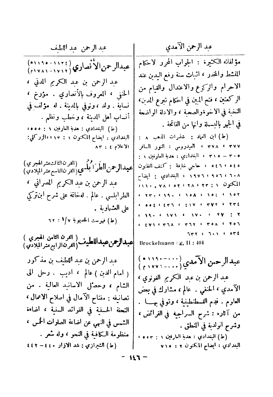 (ط) البغدادي: هدية العارفين 1: 553، البغدادي: ايضاح المكنون 2: 715 عبد الرحمن الانصاري (1124 - 1195 هـ) (1712 - 1781 م) عبد الرحمن بن عبد الكريم المدني، الحنفي، المعروف بالانصاري.
