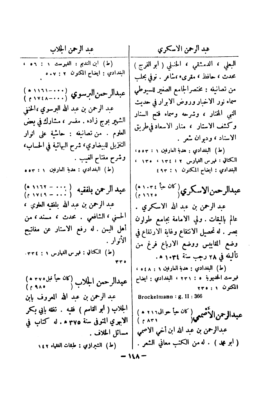 (ط) البغدادي: هدية العارفين 1: 553، الكتاني: فهرس الفهارس 2: 134، 135، البغدادي: ايضاح المكنون 1: 493 عبد الرحمن الاسكري (كان حيا 1034 هـ) (1625 م) عبد الرحمن بن عبد الله الاسكري.