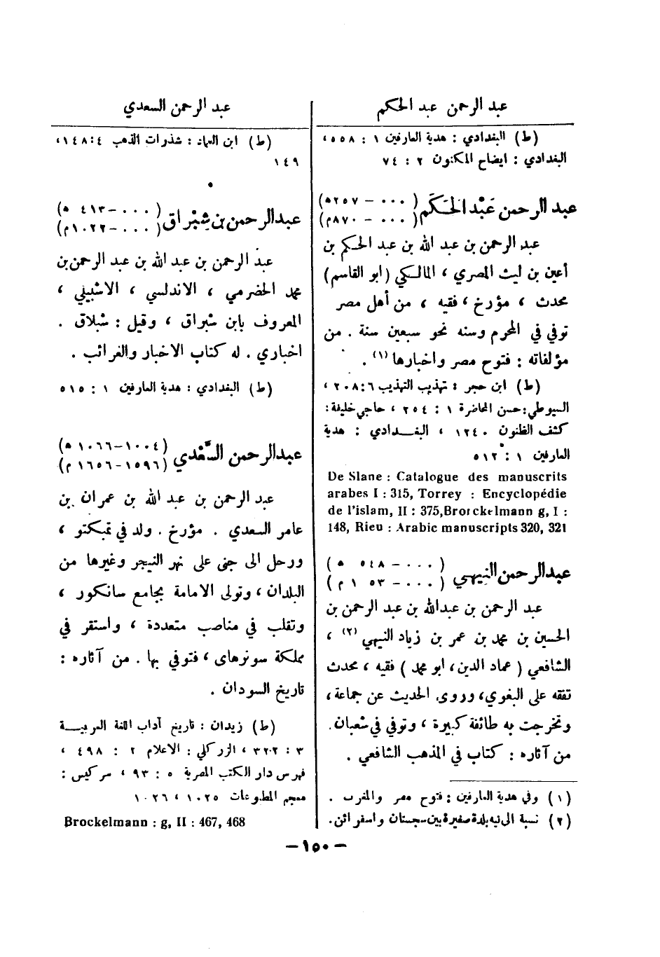 (ط) البغدادي: هدية العارفين 1: 515 عبد الرحمن السعدي (1004 - 1066 هـ) (1596 - 1656 م) عبد الرحمن بن عبد الله بن عمران بن عامر السعدي.
