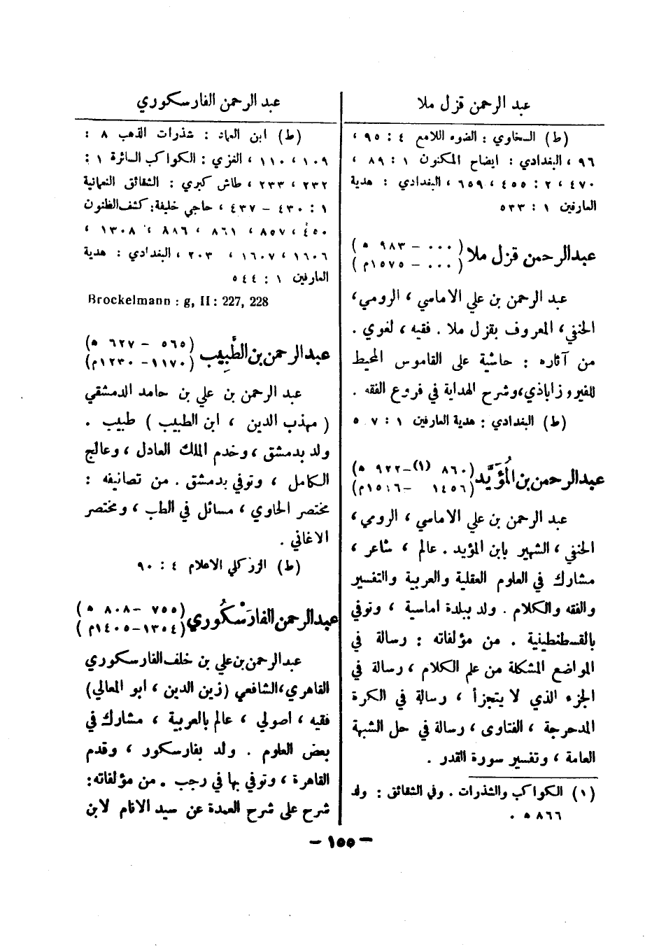 (ط) ابن العماد: شذرات الذهب 8: 109، 110، الغزي: الكواكب السائرة 1: 232، 233، طاش كبري: الشقائق النعمانية 1: 430 - 437، حاجي خليفة: كشف الظنون 450، 857، 861، 886، 1308، 1606، 1607، 203، البغدادي: هدية العارفين 1: 544 228 , 227: Brockelmann: g , II عبد الرحمن بن الطبيب (565 - 627 هـ) (1170 - 1230 م)