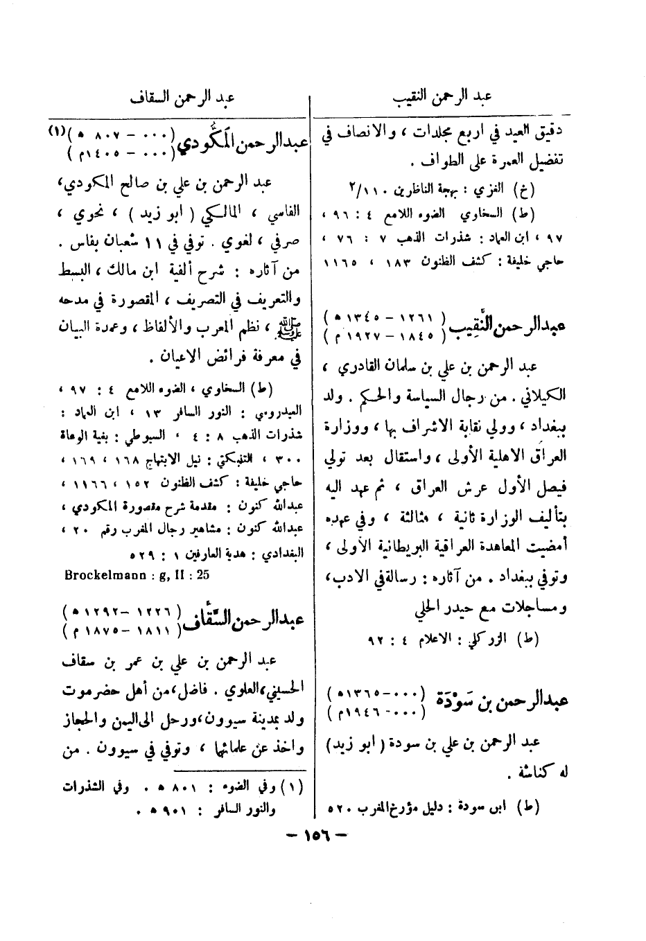 (ط) السخاوي، الضوء اللامع 4: 97، العيدروسي: النور السافر 13، ابن العماد: شذرات الذهب 8: 4، السيوطي: بغية الوعاة 300، التنبكتي: نيل الابتهاج 168، 169، حاجي خليفة: كشف الظنون 152، 1166، عبد الله كنون: مقدمة شرح مقصورة المكودي، عبد الله كنون: مشاهير رجال المغرب رقم 20، البغدادي: هدية العارفين 1: 529 25: Brockelmann: g , II عبد الرحمن السقاف (1226 - 1292 هـ) (1811 - 1875 م) عبد الرحمن بن علي بن عمر بن سقاف الحسيني، العلوي.