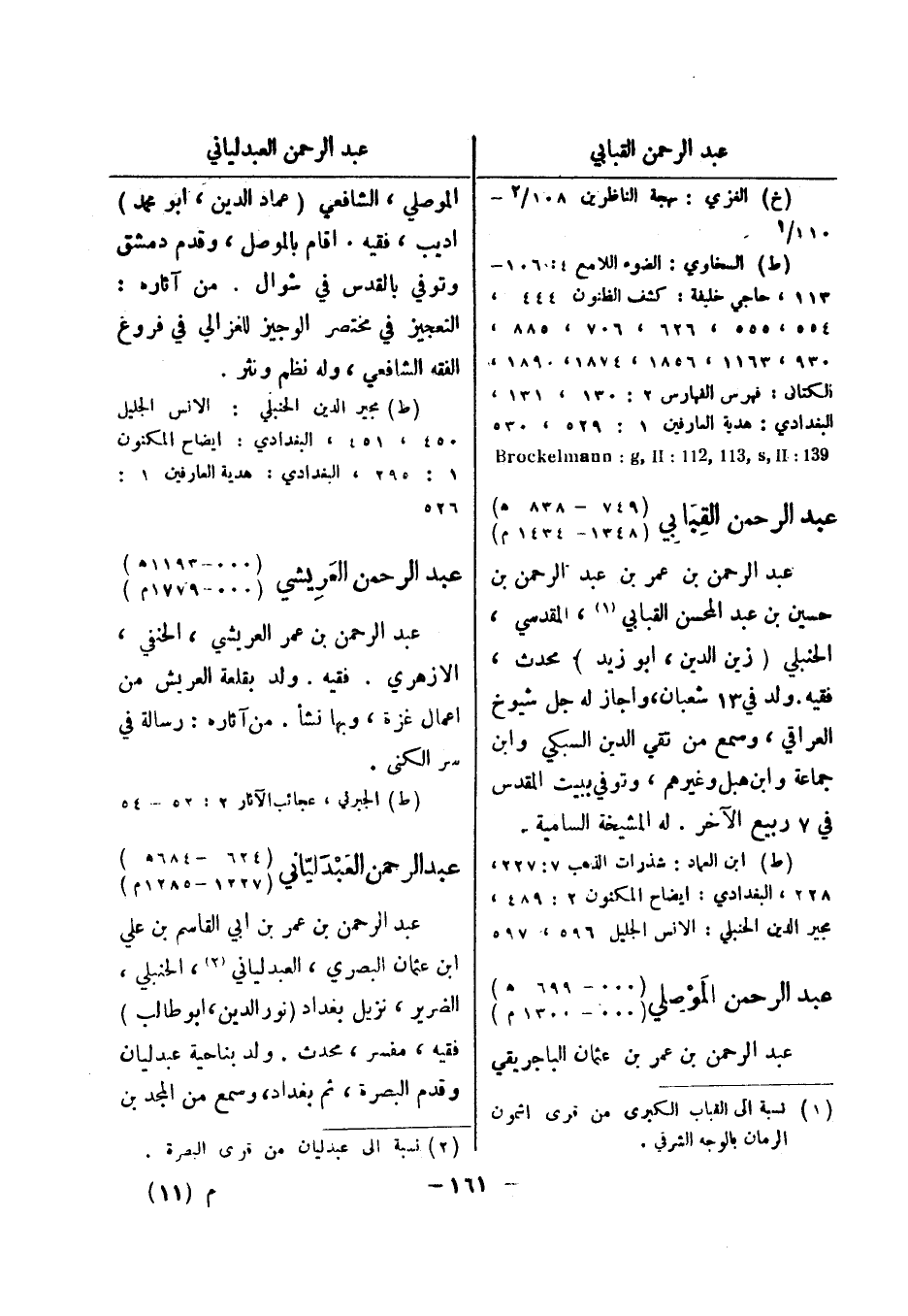 (ط) الجبرتي، عجائب الآثار 2: 52 - 54 عبد الرحمن العبدلياني (624 - 1193 هـ) (000 - 1285 م) عبد الرحمن بن عمر بن ابي القاسم بن علي ابن عثمان البصري، العبدلياني (2) ، الحنبلي، الضرير، نزيل بغداد (نور الدين، أبو طالب) فقيه، مفسر، محدث.