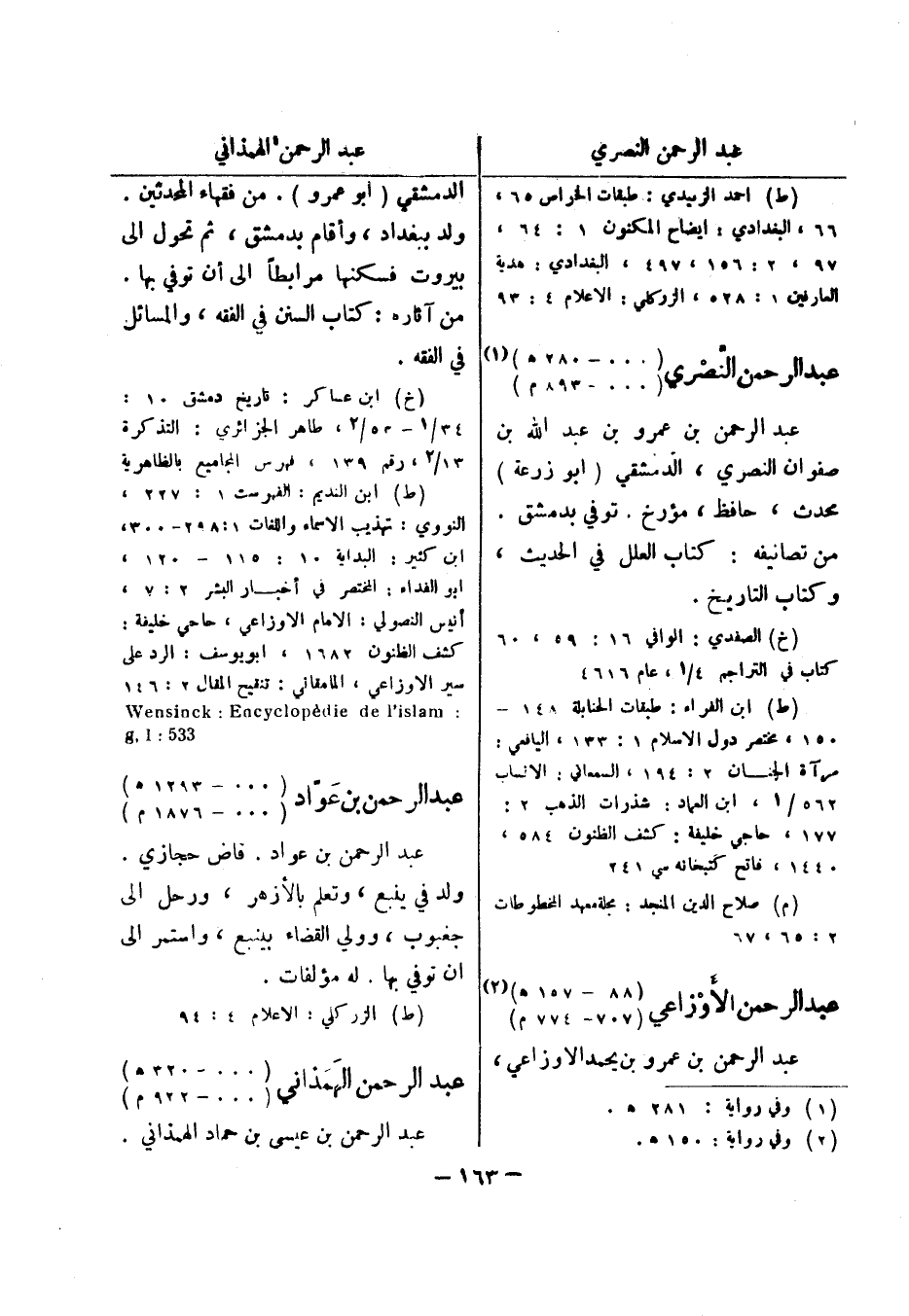 (خ) الصفدي: الوافي 16: 59، 60 كتاب في التراجم 4 / 1، عام 4616 (ط) ابن الفراء: طبقات الحنابلة 148 - 150، مختصر دول الاسلام 1: 133، اليافعي: مرآة الجنان 2: 194، السمعاني: الانساب 562 / 1، ابن العماد: شذرات الذهب 2: 177، حاجي خليفة: كشف الظنون 584، 1440، فاتح كتبخانه سي 241 (م) صلاح الدين المنجد: مجلة معهد المخطوطات 2: 65، 67 عبد الرحمن الاوزاعي (88 - 157 هـ) (2) (707 - 774 م) عبد الرحمن بن عمرو بن يحمد الاوزاعي، الدمشقي (أبو عمرو) .