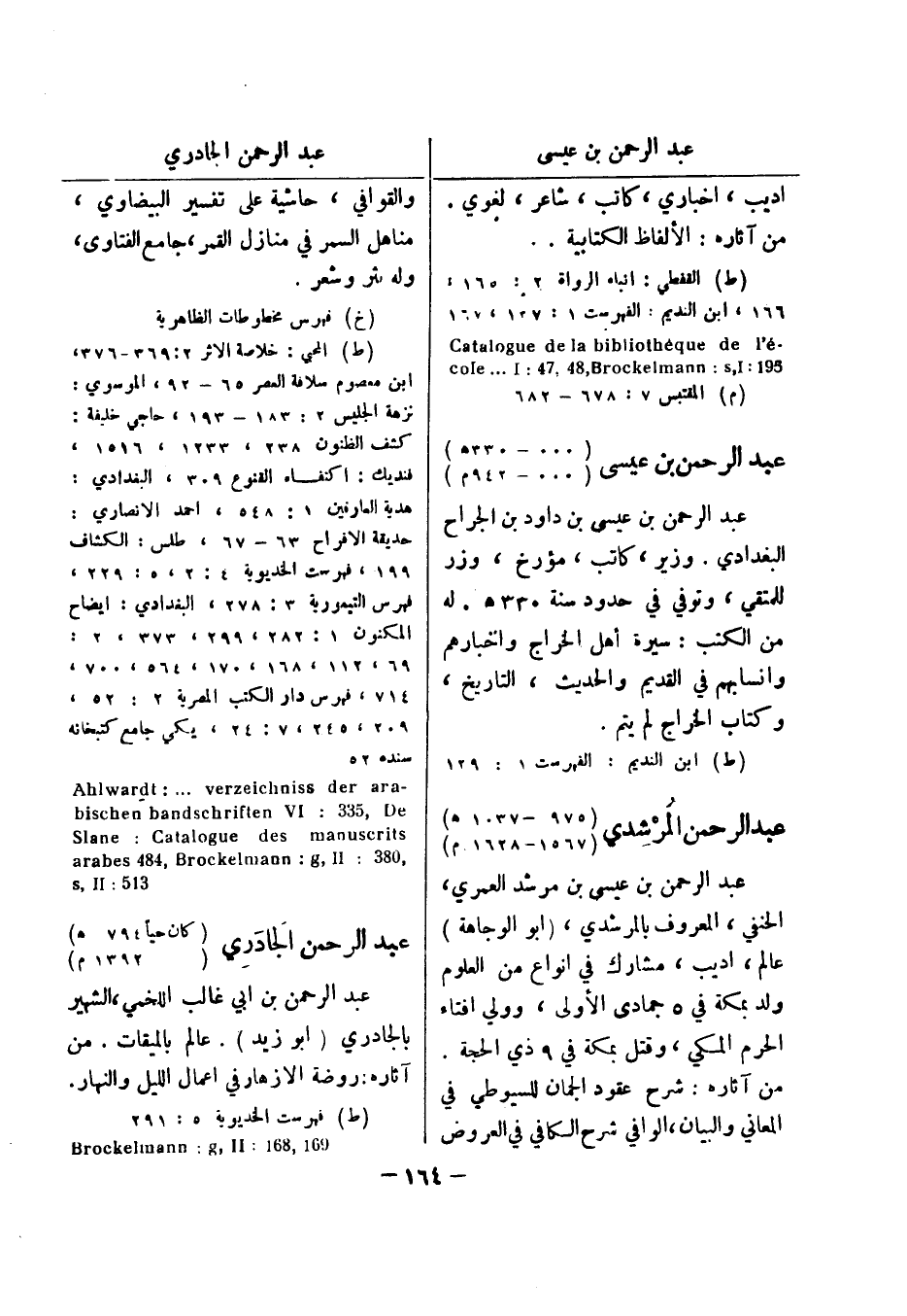 (ط) ابن النديم: الفهرست 1: 129 عبد الرحمن المرشدي (975 - 1037 هـ) (1567 - 1628 م) عبد الرحمن بن عيسى بن مرشد العمري، الحنفي، المعروف بالمرشدي، (أبو الوجاهة) عالم، اديب، مشارك في انواع من العلوم