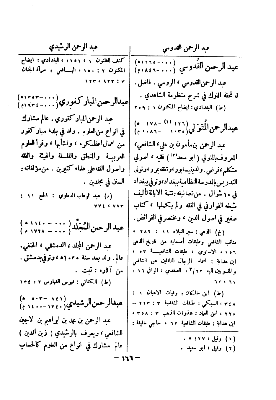 (ط) البغدادي: ايضاح المكنون 1: 259 عبد الرحمن المتولي (426 (1) - 478 هـ) (1035 - 1086 م) عبد الرحمن بن مأمون بن علي، الشافعي، المعروف بالمتولي (أبو سعد (2) فقيه، اصولي متكلم، فرضي.