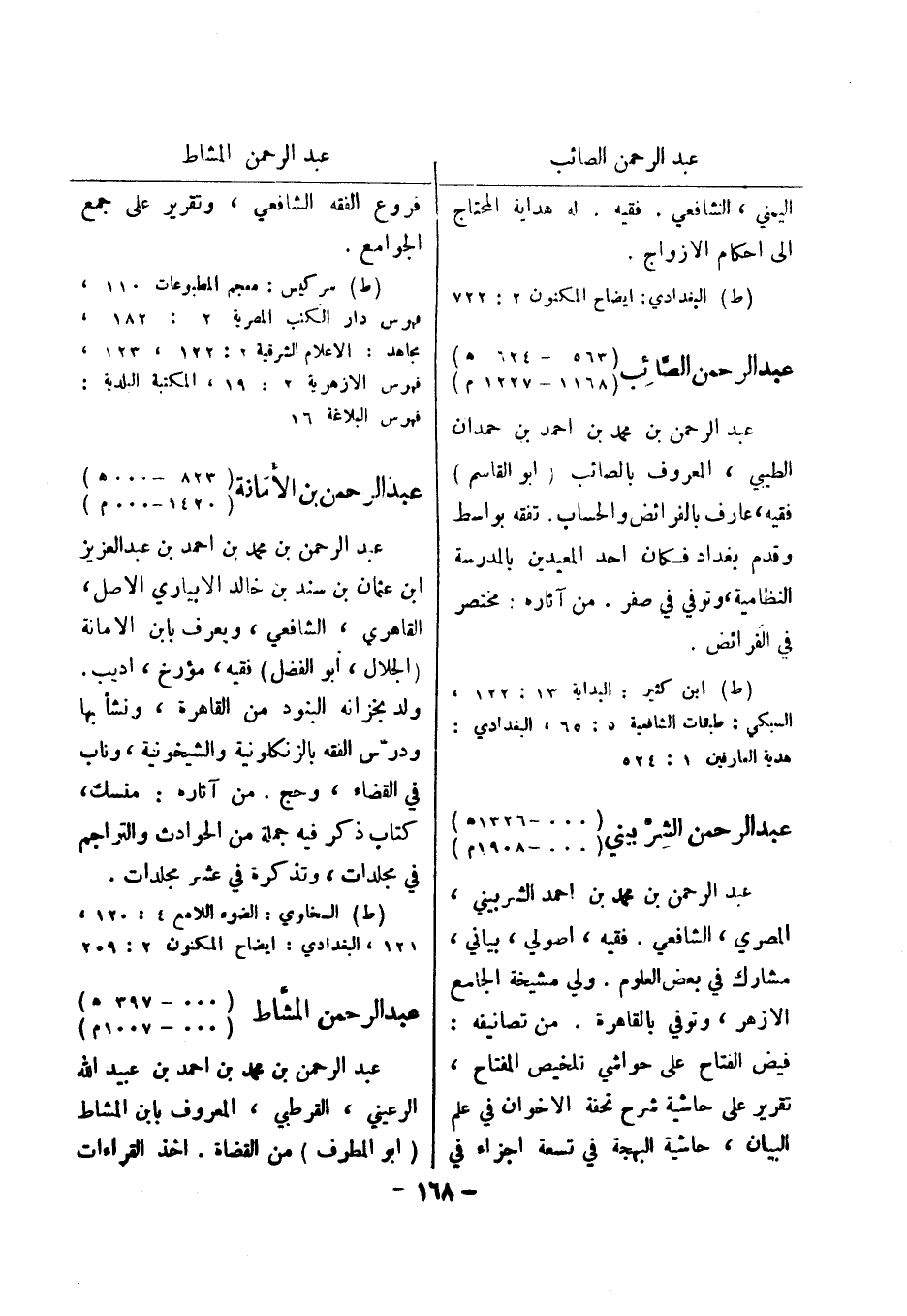 (ط) ابن كثير: البداية 13: 122، السبكي: طبقات الشافعية 5: 65، البغدادي: هدية العارفين 1: 524 عبد الرحمن الشربيني (000 - 1326 هـ) (000 - 1908 م) عبد الرحمن بن محمد بن احمد الشربيني، المصري، الشافعي.