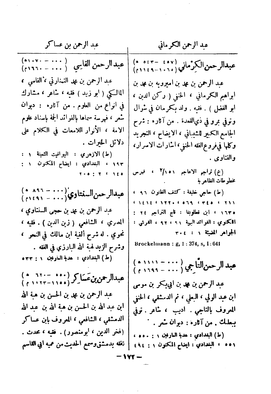 (ط) البغدادي: هدية العارفين 1: 550، 551، البغدادي: ايضاح المكنون 1: 494 عبد الرحمن الفاسي (000 - 1070 هـ) (000 - 1660 م) عبد الرحمن بن محمد التمنارتي، الفاسي، المالكي (أبو زيد) فقيه، شاعر، مشارك في انواع من العلوم.