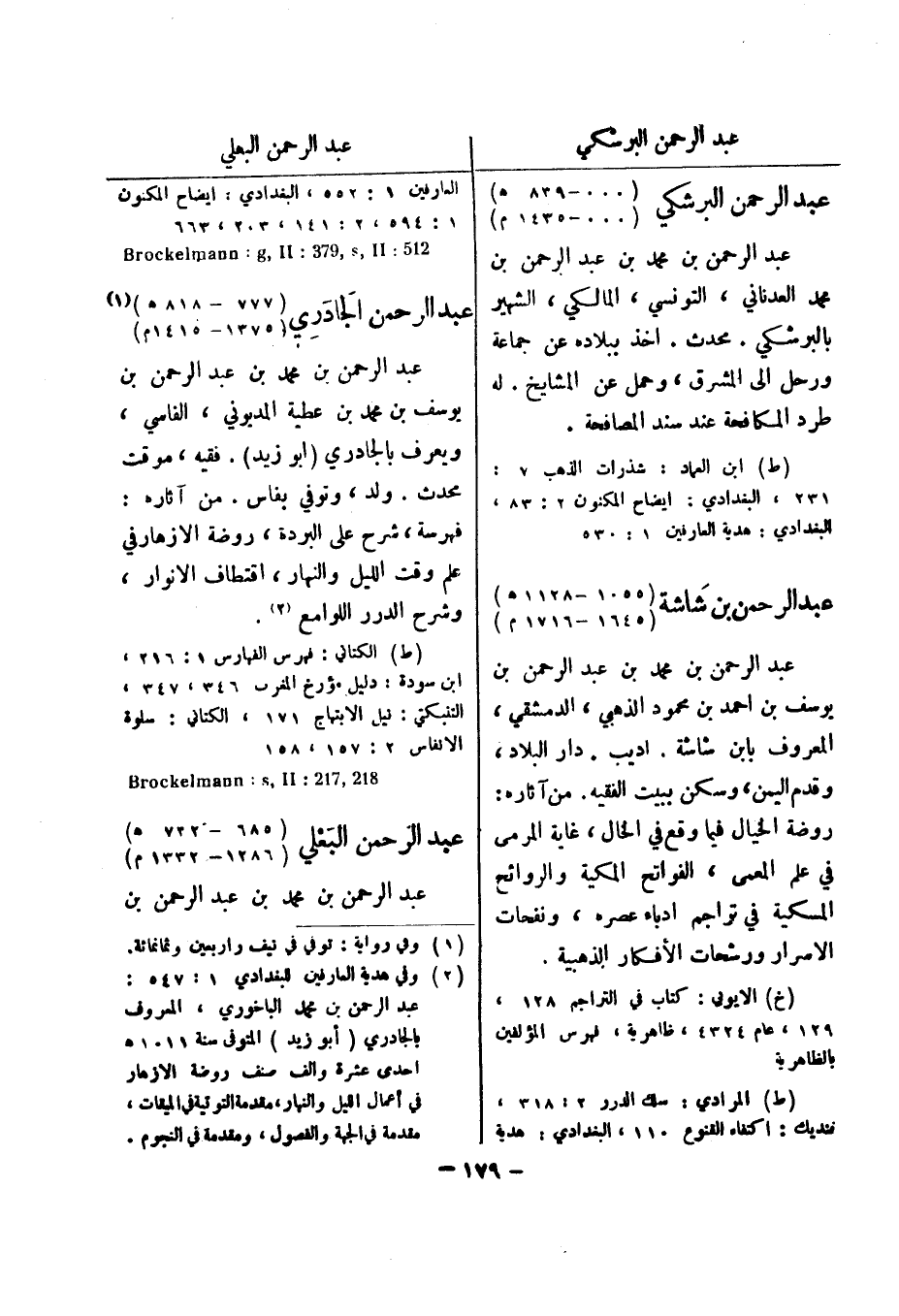(ط) الكتاني: فهرس الفهارس 1: 216، ابن سودة: دليل مؤرخ المغرب 346، 347، التنبكتي: نيل الابتهاج 171، الكتاني: سلوة الانفاس 2: 157، 158 218 , 217: Brockelmann: s , II عبد الرحمن البعلي (685 - 732 هـ) (1286 - 1332) عبد الرحمن بن محمد بن عبد الرحمن بن