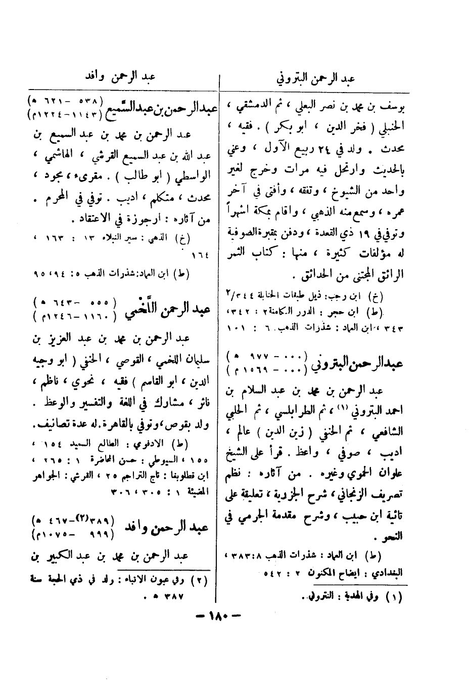 (خ) ابن رجب: ذيل طبقات الحنابلة 344 / 2 (ط) ابن حجر: الدرر الكامنة 2: 342، 343، ابن العماد: شذرات الذهب 6: 101 عبد الرحمن البتروني (000 - 977 هـ) (000 - 1569 م) عبد الرحمن بن محمد بن عبد السلام بن احمد البتروني (1) ، ثم الطرابلسي، ثم الحلبي الشافعي، ثم الحنفي (زين الدين) عالم، اديب، صوفي، واعظ.