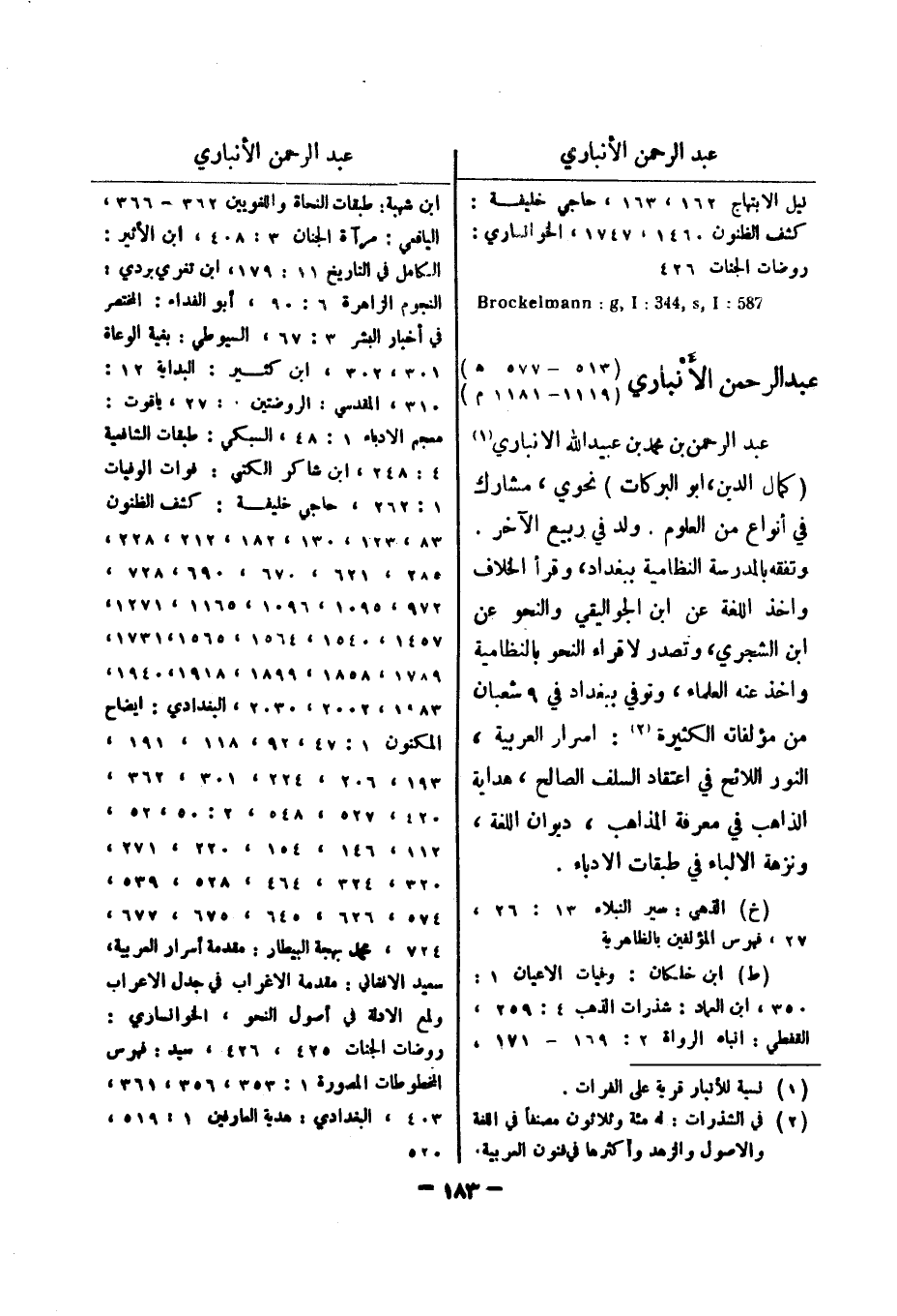 نيل الابتهاج 162، 163، حاجي خليفة: كشف الظنون 1460، 1747 الخوانساري: روضات الجنات 426 587: Brockelmann: g , I: 443 , s , I عبد الرحمن الانباري (513 - 577 هـ) (1119 - 1181 م) عبد الرحمن بن محمد عبيد الله الانباري (1) (كمال الدين، أبو البركات) نحوي، مشارك في أنواع من العلوم.