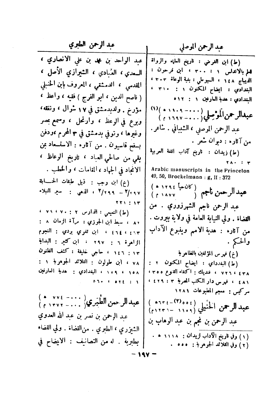 (ط) ابن الفرضي: تاريخ العلماء والرواة للعلم بالاندلس 1: 300، ابن فرحون: الديباج 148، السيوطي: بغية الوعاة 303، البغدادي: ايضاح المكنون 1: 310، البغدادي: هدية العارفين 1: 512 عبد الرحمن الموصلي (000 - 1109 هـ) (1) (000 - 1697 م) عبد الرحمن الموصلي، الشيباني.