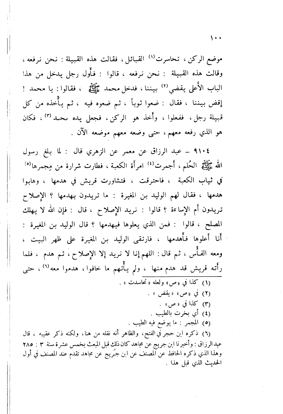 ٩١٠٤ - عَنْ مَعْمَرٍ، عَنِ الزُّهْرِيِّ قَالَ: " لَمَّا بَلَغَ رَسُولُ اللَّهِ صَلَّى اللهُ عَلَيْهِ وَسَلَّمَ الْحُلُمَ أَجْمَرَتِ امْرَأَةٌ الْكَعْبَةَ، فَطَارَتْ شَرَارَةٌ مِنْ مِجْمَرِهَا فِي ثِيَابِ الْكَعْبَةِ، فَاحْتَرَقَتْ، فَتَشَاوَرَتْ قُرَيْشُ فِي هَدْمِهَا، وَهَابُوا هَدْمَهَا، فَقَالَ لَهُمُ الْوَلِيدُ بْنُ الْمُغِيرَةِ: مَا تُرِيدُونَ بِهَدْمِهَا؟ الْإِصْلَاحَ تُرِيدُونَ، أَمِ الْإِسَاءَةُ؟ قَالُوا: نُرِيدُ الْإِصْلَاحَ قَالَ: فَإِنَّ اللَّهَ لَا يُهْلِكُ الْمُصْلِحَ قَالُوا: فَمَنِ الَّذِي يَعْلُوهَا فَيَهْدِمُهَا؟ قَالَ الْوَلِيدُ بْنُ الْمُغِيرَةِ: أَنَا أَعْلُوهَا فَأَهْدِمُهَا، فَارْتَقَى الْوَلِيدُ بْنُ الْمُغِيرَةِ عَلَى ظَهْرِ الْبَيْتِ وَمَعَهُ الْفَأْسُ، ثُمَّ قَالَ: اللَّهُمَّ إِنَّا لَا نُرِيدُ إِلَّا الْإِصْلَاحَ، ثُمَّ هَدَمَ، فَلَمَّا رَأَتْهُ قُرَيْشٌ قَدْ هَدَمَ مِنْهَا، وَلَمْ يَأْتِهِمْ مَا خَافُوا، هَدَمُوا مَعَهُ حَتَّى ⦗١٠١⦘ إِذَا بَنَوْا، فَبَلَغُوا مَوْضِعَ الرُّكْنِ، اخْتَصَمَتْ قُرَيْشٌ فِي الرُّكْنِ، أَيُّ الْقَبَائِلِ يَلِي رَفْعَهُ؟ حَتَّى كَادَ يُشْجَرُ بَيْنَهُمْ قَالُوا: تَعَالَوْا نُحَكِّمُ أَوَّلَ مَنْ يَطْلُعُ عَلَيْنَا مِنْ هَذِهِ السِّكَّةِ، فَاصْطَلَحُوا عَلَى ذَلِكَ، فَطَلَعَ عَلَيْهِمْ رَسُولُ اللَّهِ صَلَّى اللهُ عَلَيْهِ وَسَلَّمَ وَهُوَ غُلَامٌ، عَلَيْهِ وِشَاحٌ نَمِرَةٌ، فَحَكَّمُوهُ، فَأَمَرَ بِالرُّكْنِ، فَوُضِعَ فِي ثَوْبٍ، ثُمَّ أَمَرَ سَيِّدَ كُلِّ قَبِيلَةٍ، فَأَعْطَاهُ نَاحِيَةً مِنَ الثَّوْبِ، ثُمَّ ارْتَقَى هُوَ فَرَفَعُوا إِلَيْهِ الرُّكْنَ، فَكَانَ هُوَ يَضَعُهُ "
